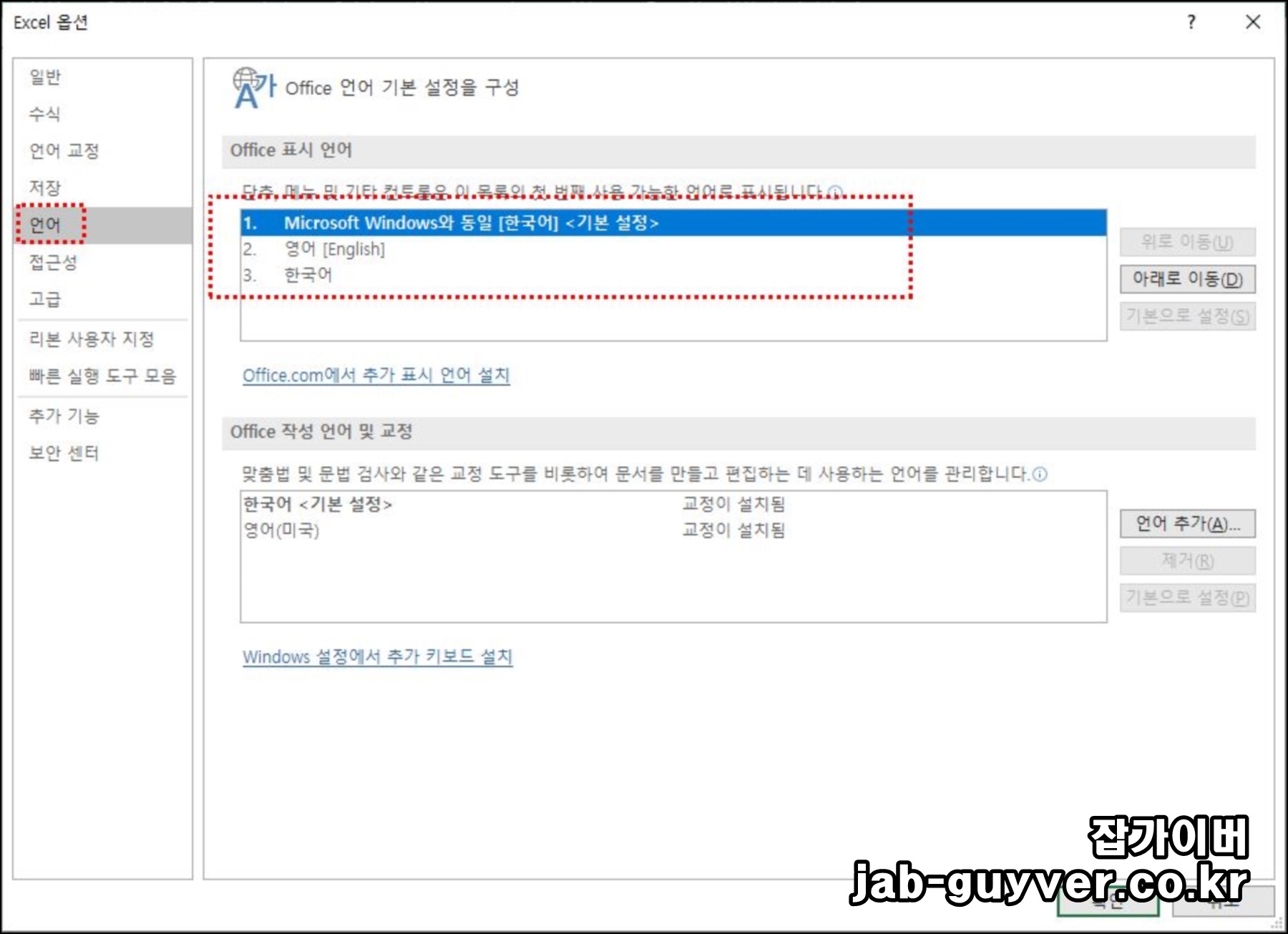 언어탭으로 이동하면 엑셀로 작업시 한글과 영어등 언어우선순위를 설정할 수 있습니다.