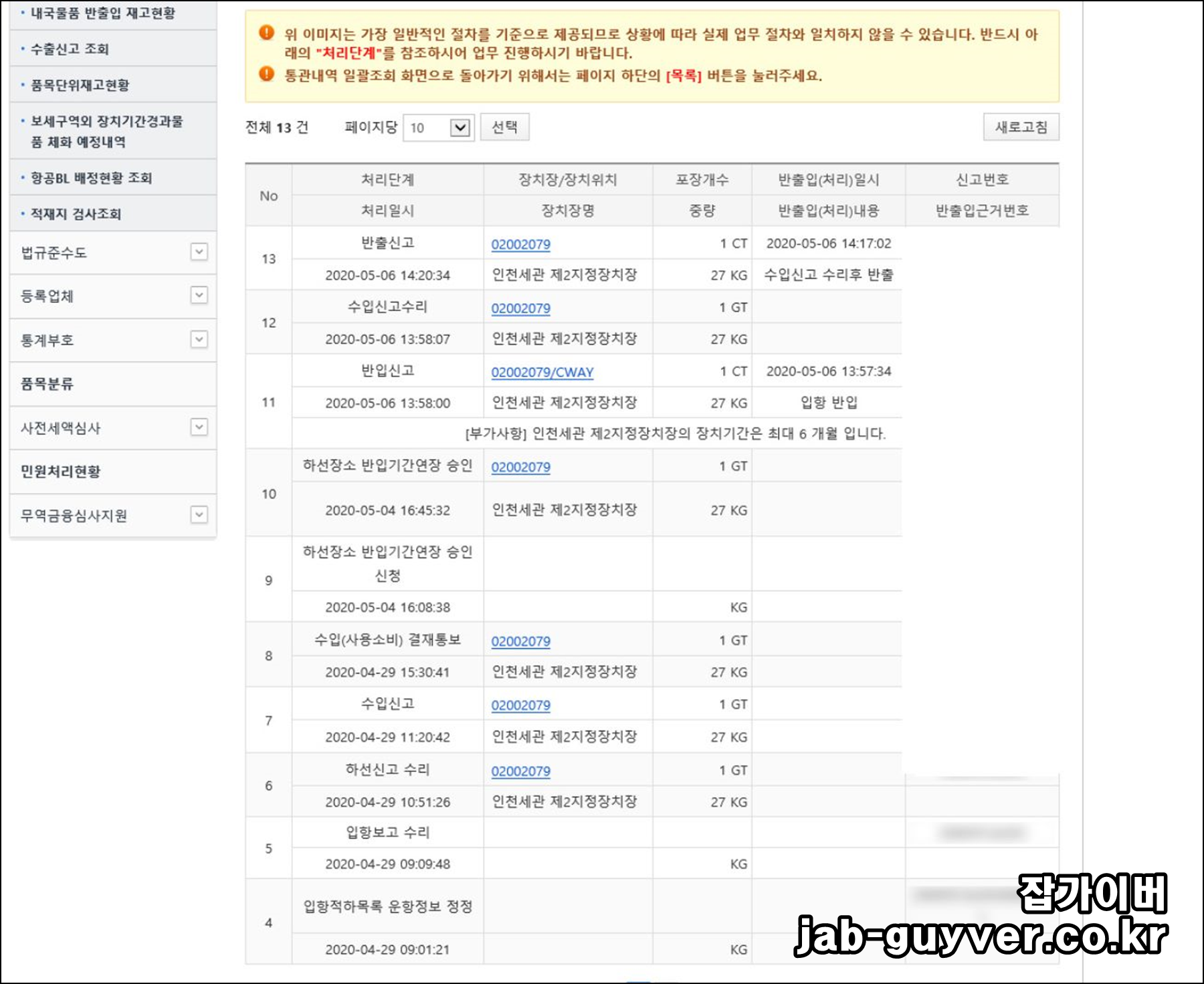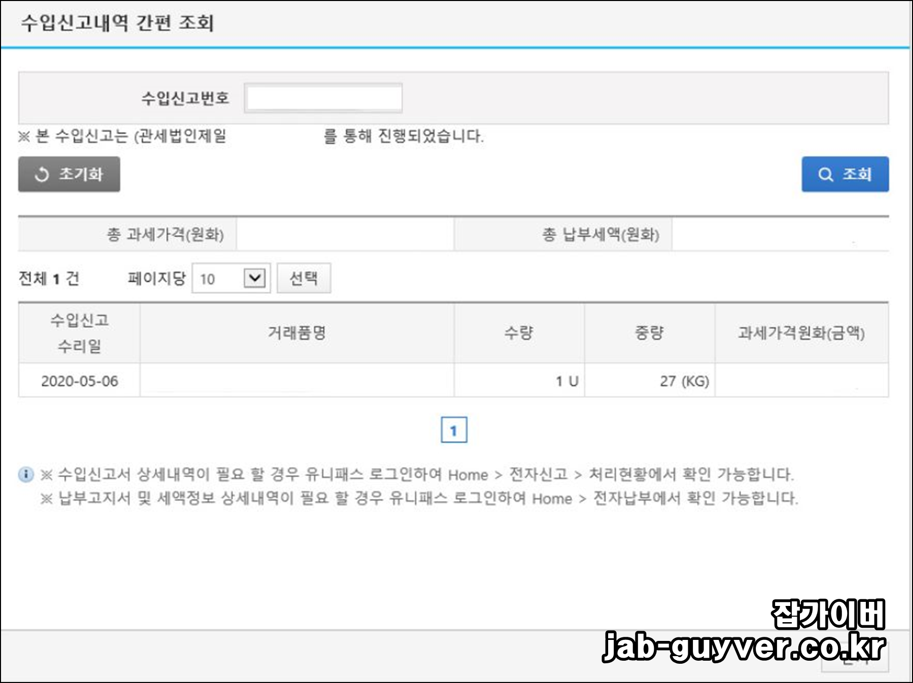 수입신고 내역을 확인할 수 있는데 처리 날짜, 제품의 이름, 수량, 중량, 과세 금액을 간단하게 조회가 가능합니다.