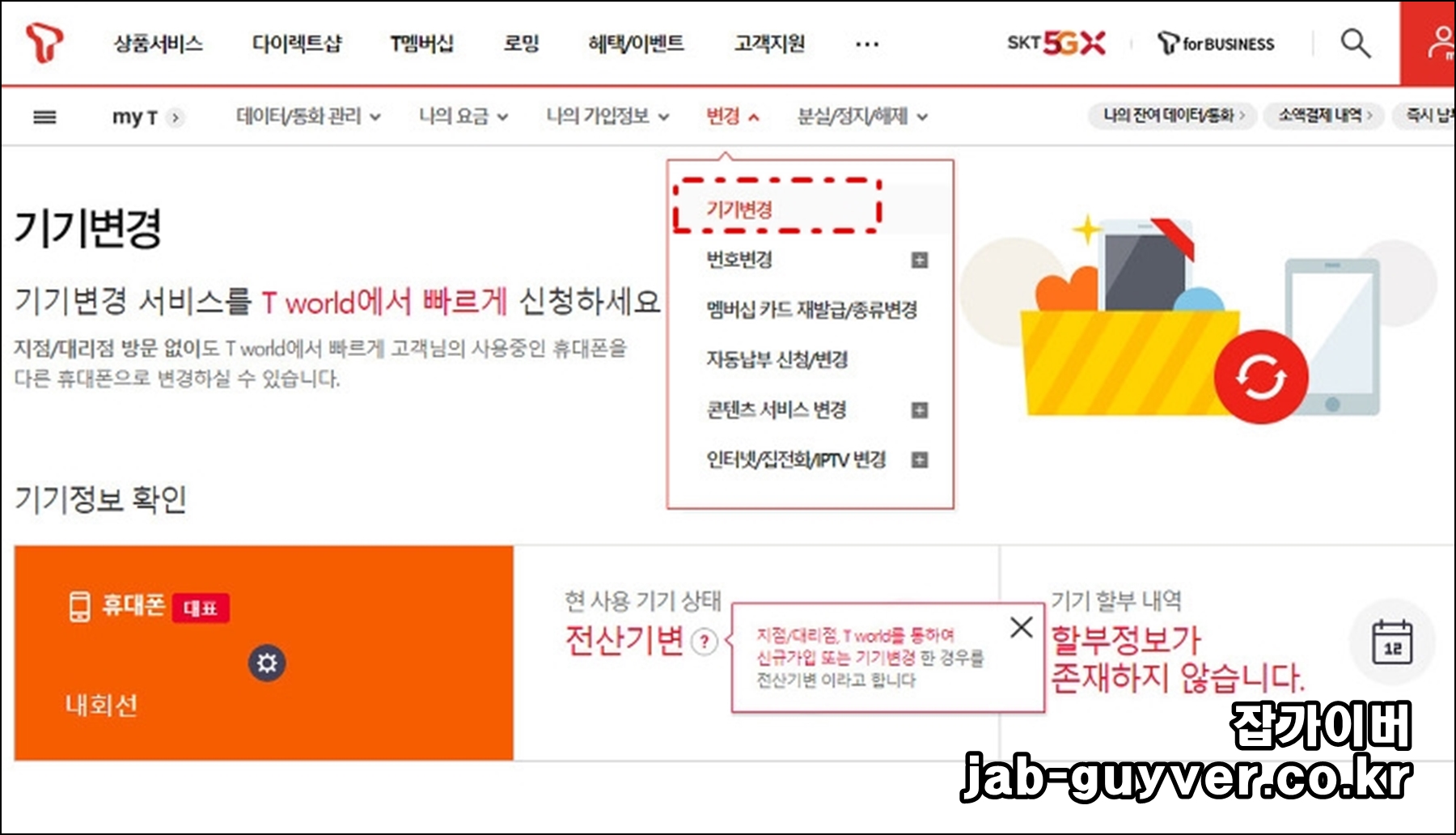 그 상태에서 인터넷으로 T월드에 접속해서 로그인 후 my T > 변경 > 기기변경로 들어갑니다.
