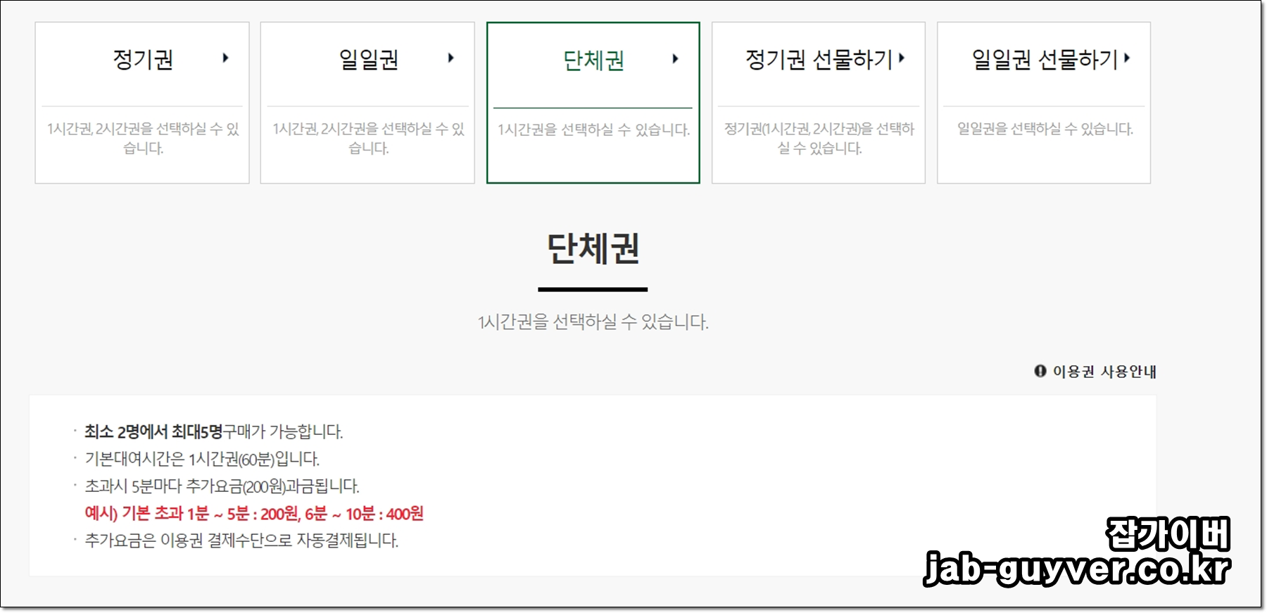 단체권의 경우 최소2명 최대 5명이 구입 가능하며 기본대여시간은 1시간입니다.