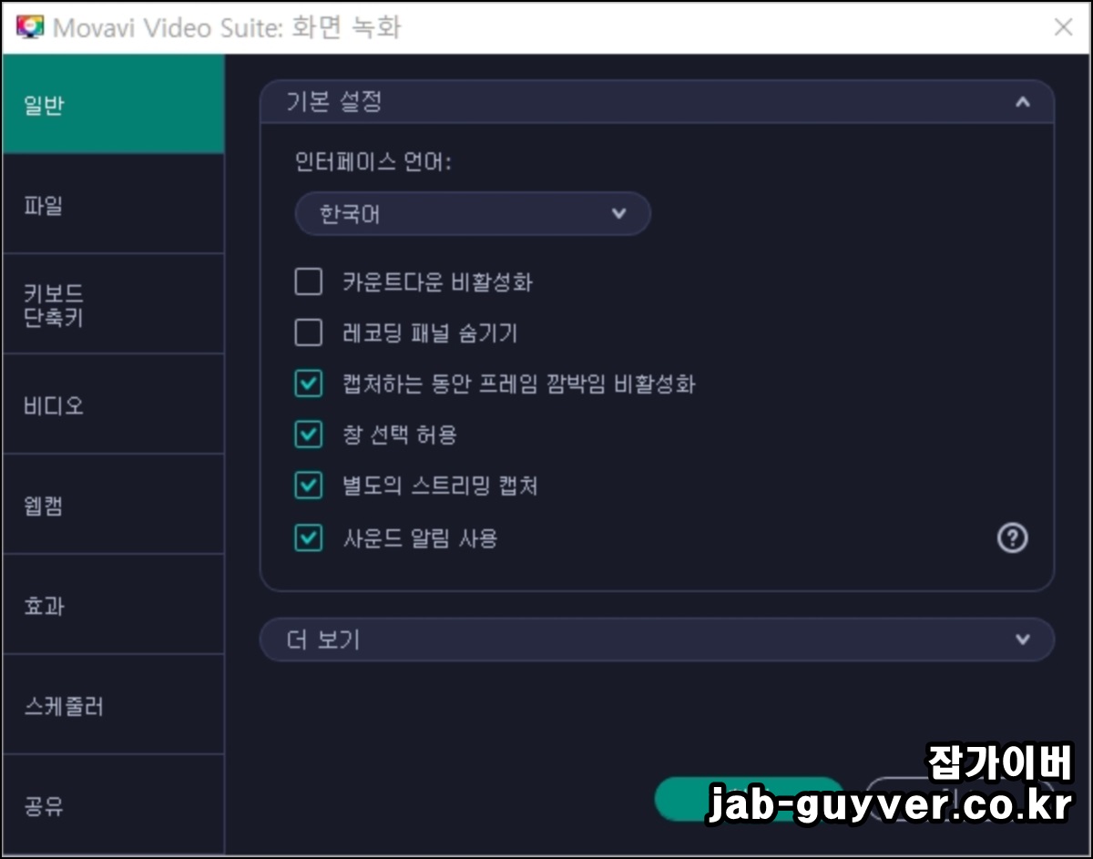 모바비 프로그램은 기본적으로 100% 한글을 지원하며 녹화버튼을 눌렀을 때 바로 녹화가 되게 하려면 "카운트다운 비활성화"를 선택합니다.