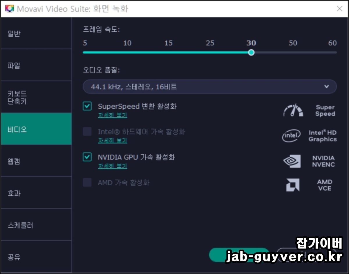 기본적으로 30 프레임이면 충분하지만 고사양 게임을 녹화하려는 경우에는 그래픽카드 가속 및 프레임을 올려주는 것이 좋습니다.