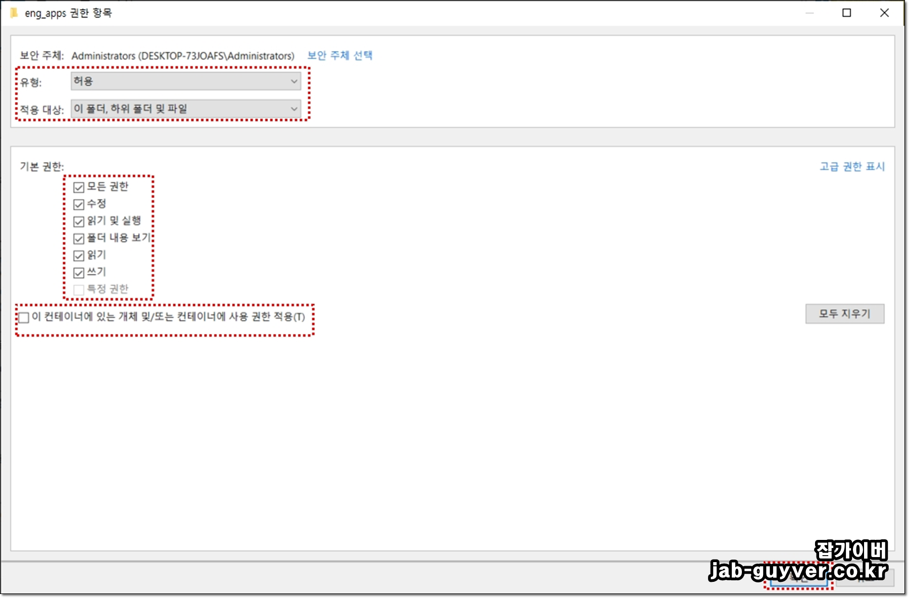 이어서 모든 권한을 선택한 후 "확인"을 클릭하면 설정이 완료되며 이때 하위 디렉터리에도 권한 설정을 부여하기 때문에 약간의 시간이 소요될 수 있습니다.