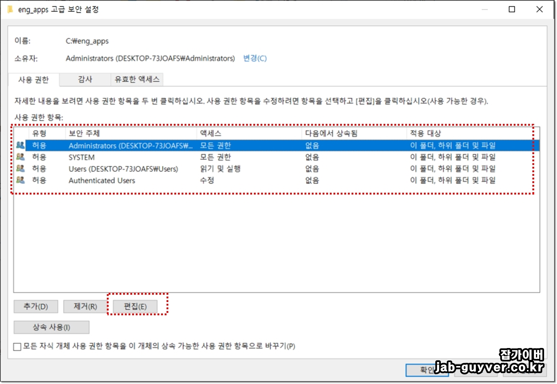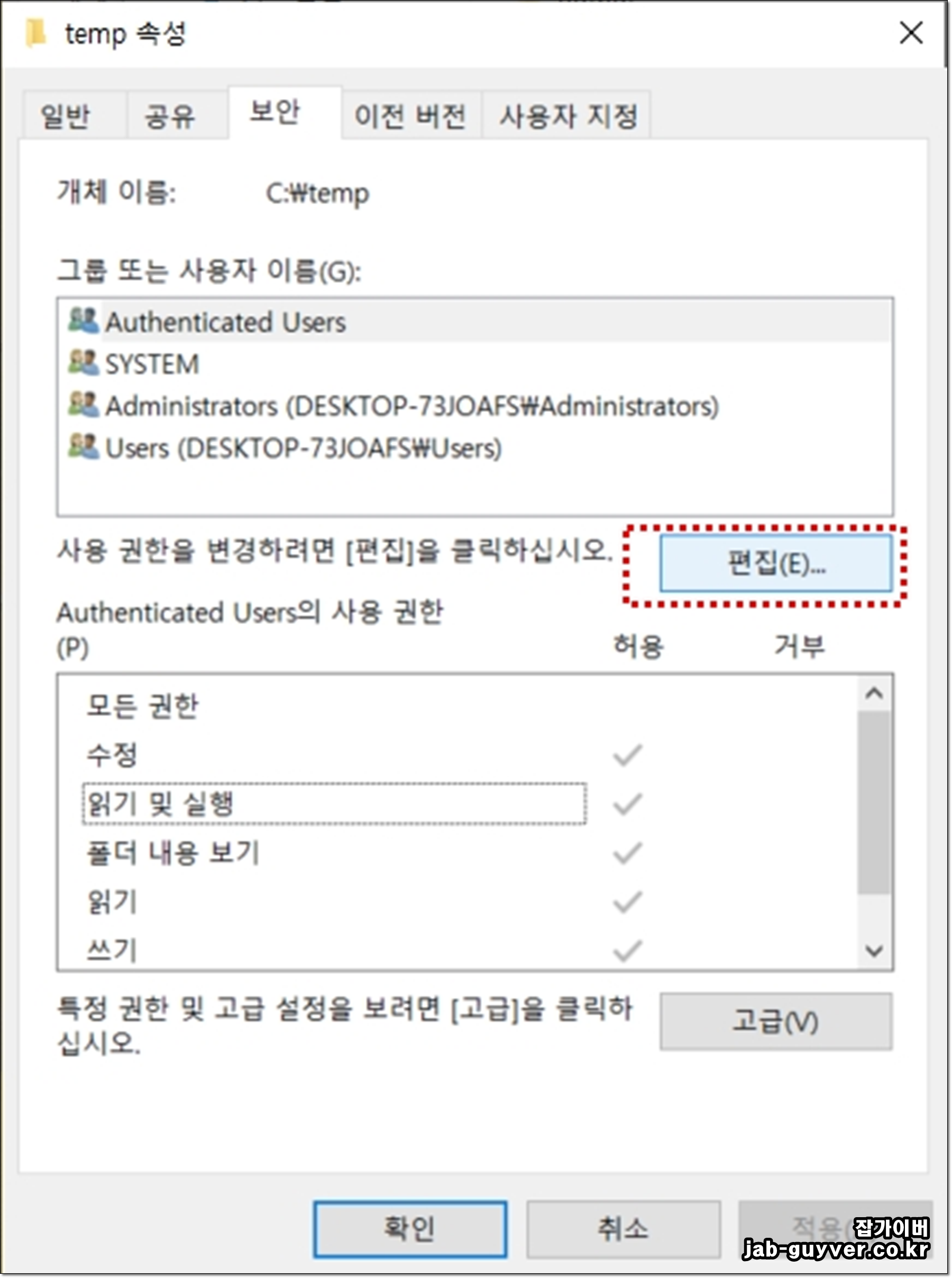 현대 해당 폴더에 대한 수정 및 읽기,실행,내용보기등의 권한이 허용과 거부 등 현재 상태를 확인할 수 있습니다.