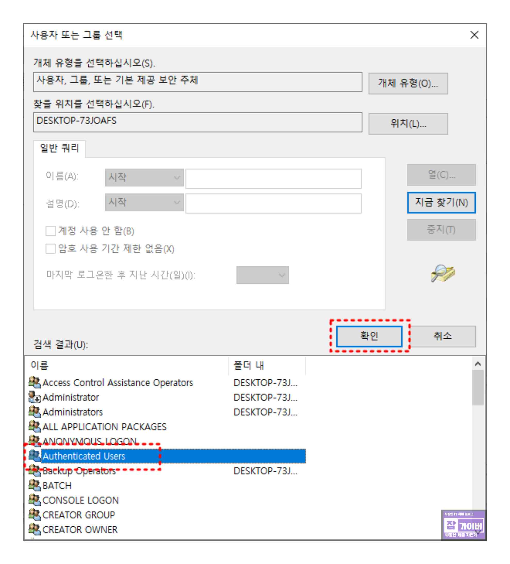 여기서 지금 찾기를 눌러 목록을 띄운 뒤 Authenticated Users를 선택하고 확인합니다.