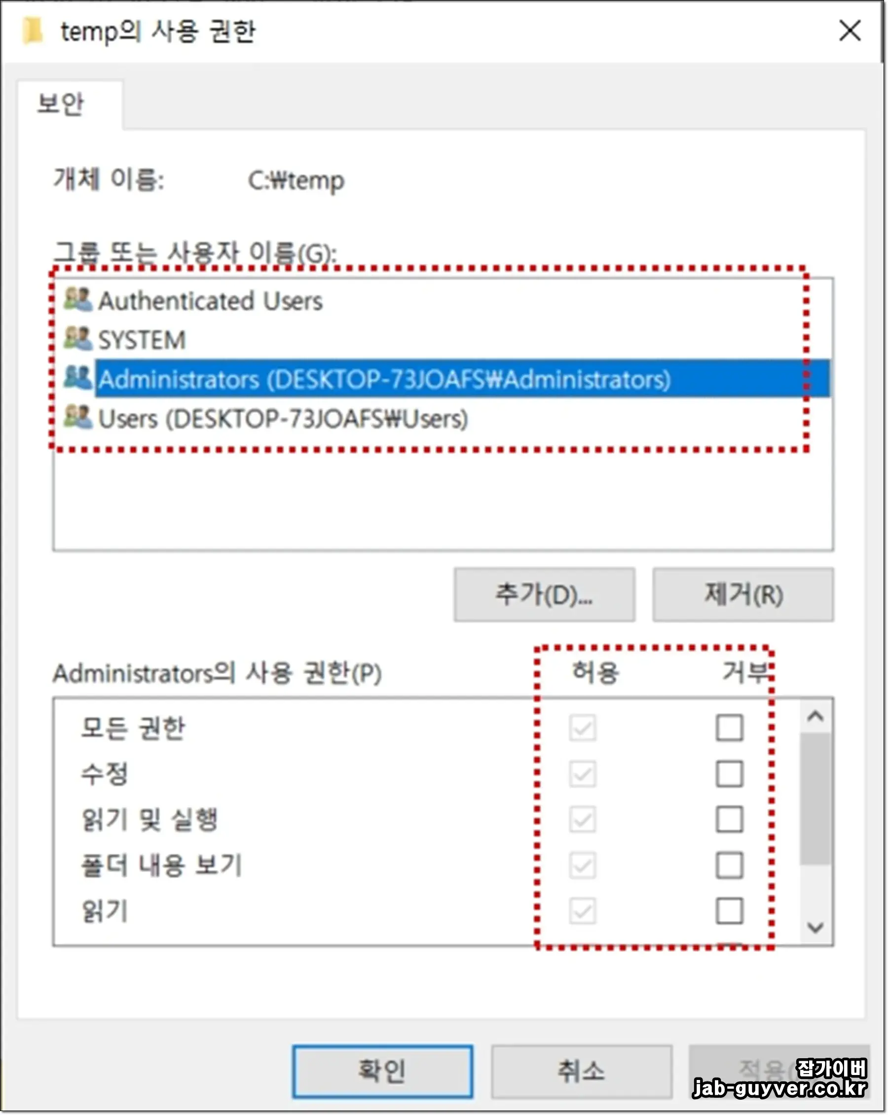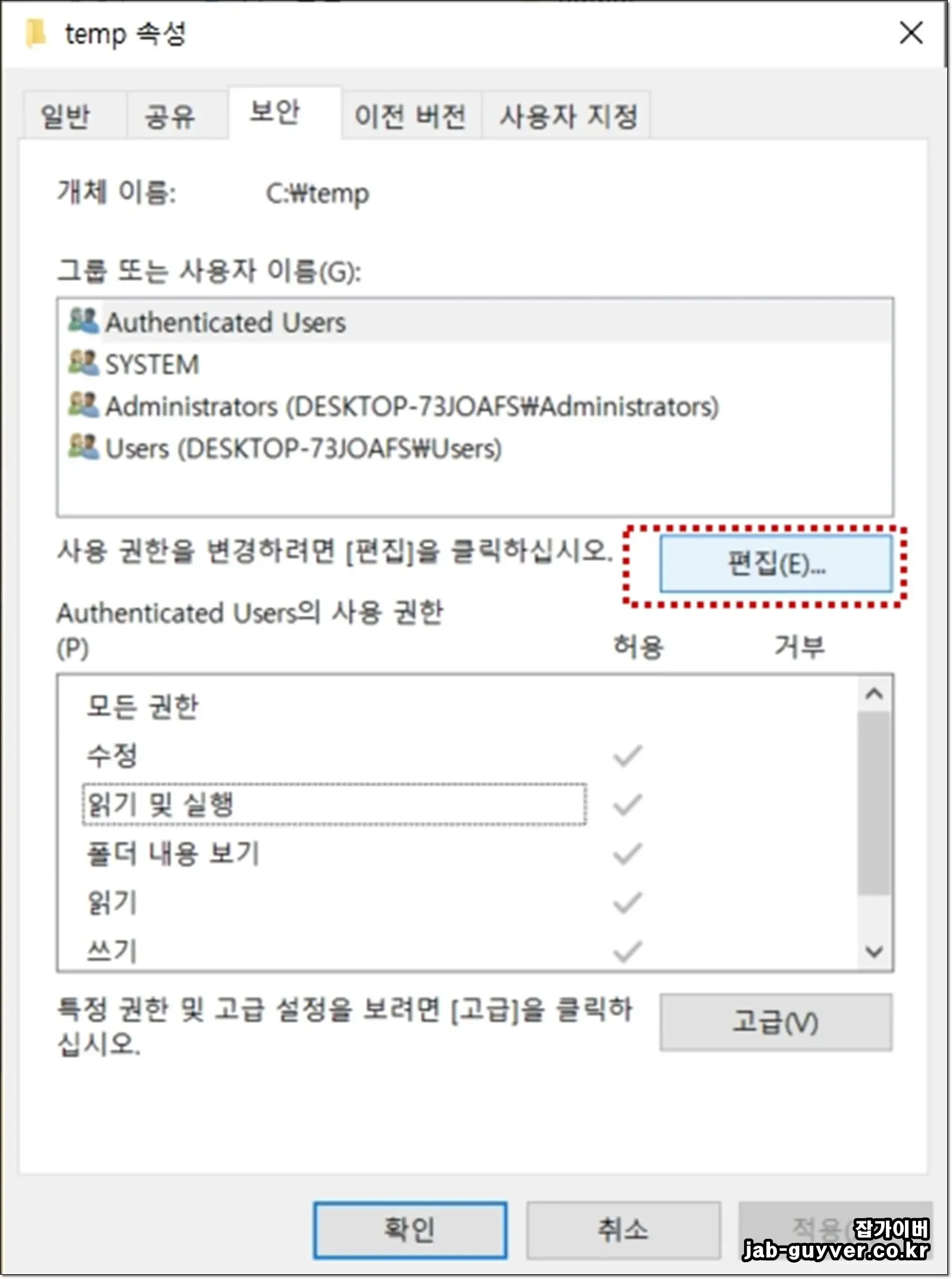 윈도우10 폴더 권한 확인 및 부여(속성 → 보안)
