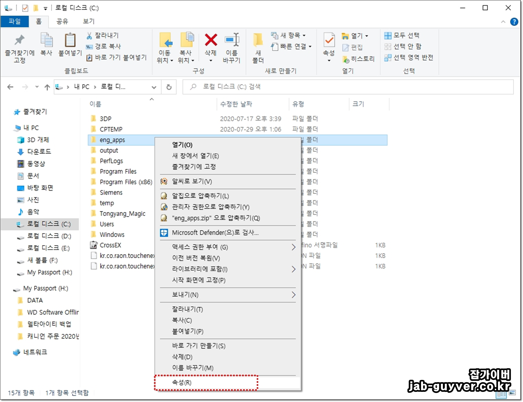 폴더에 대한 권한을 부여하기 위해 폴더 속성으로 들어갑니다.