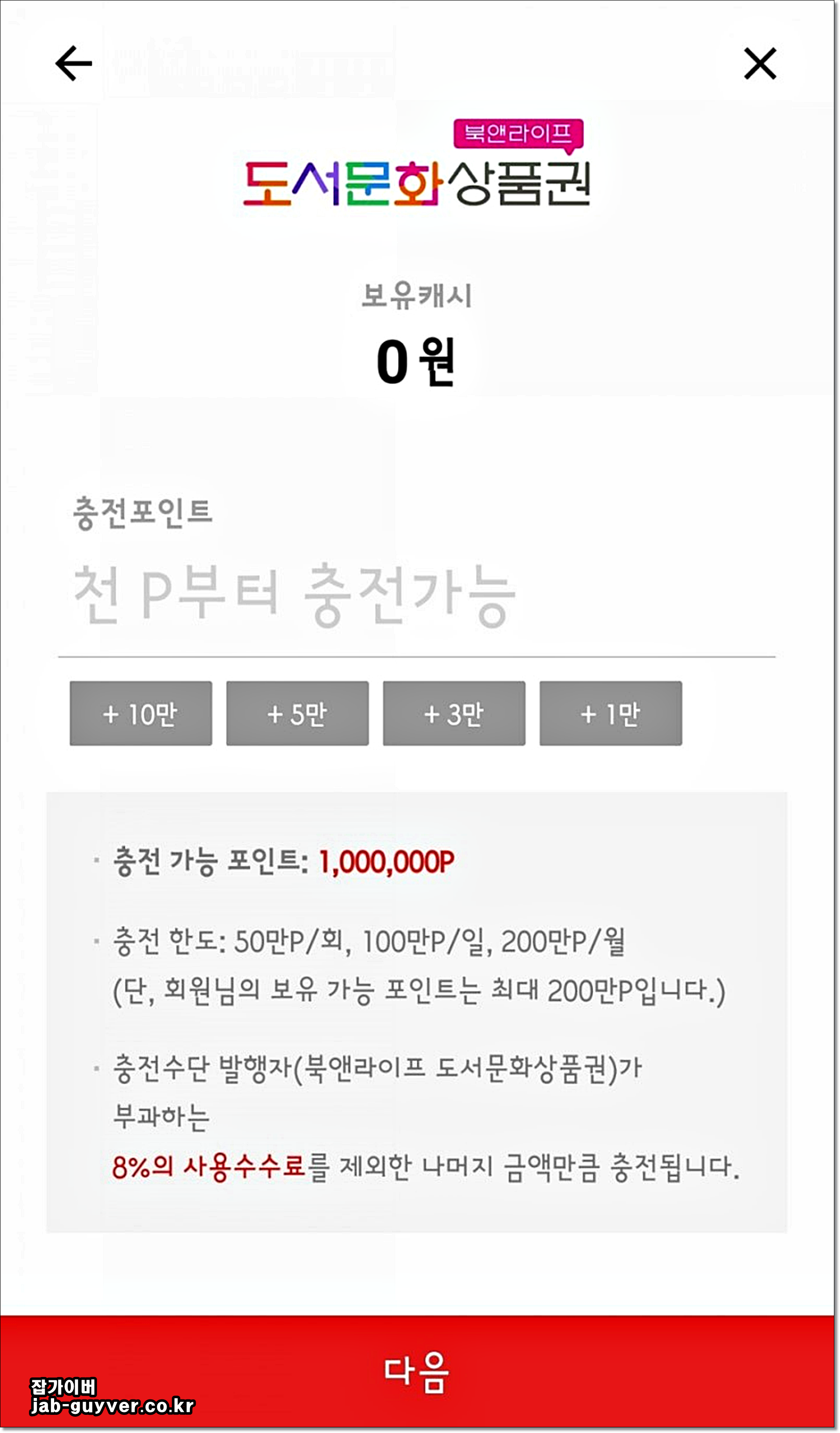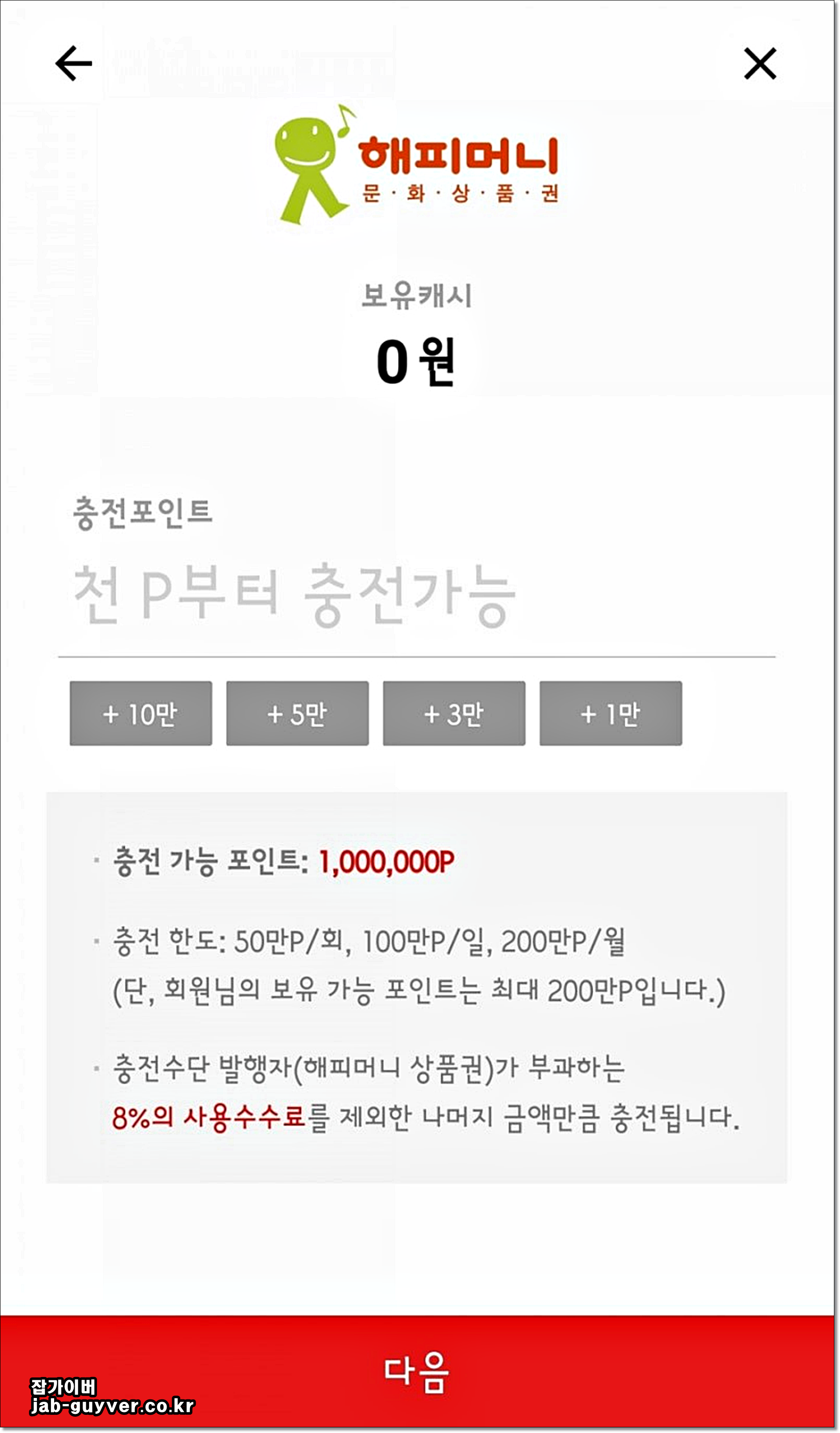 해피머니 및 북액라이프의 도서문화상품권의 경우 8%의 수수료로 페이코 앱으로 충전이 가능합니다.