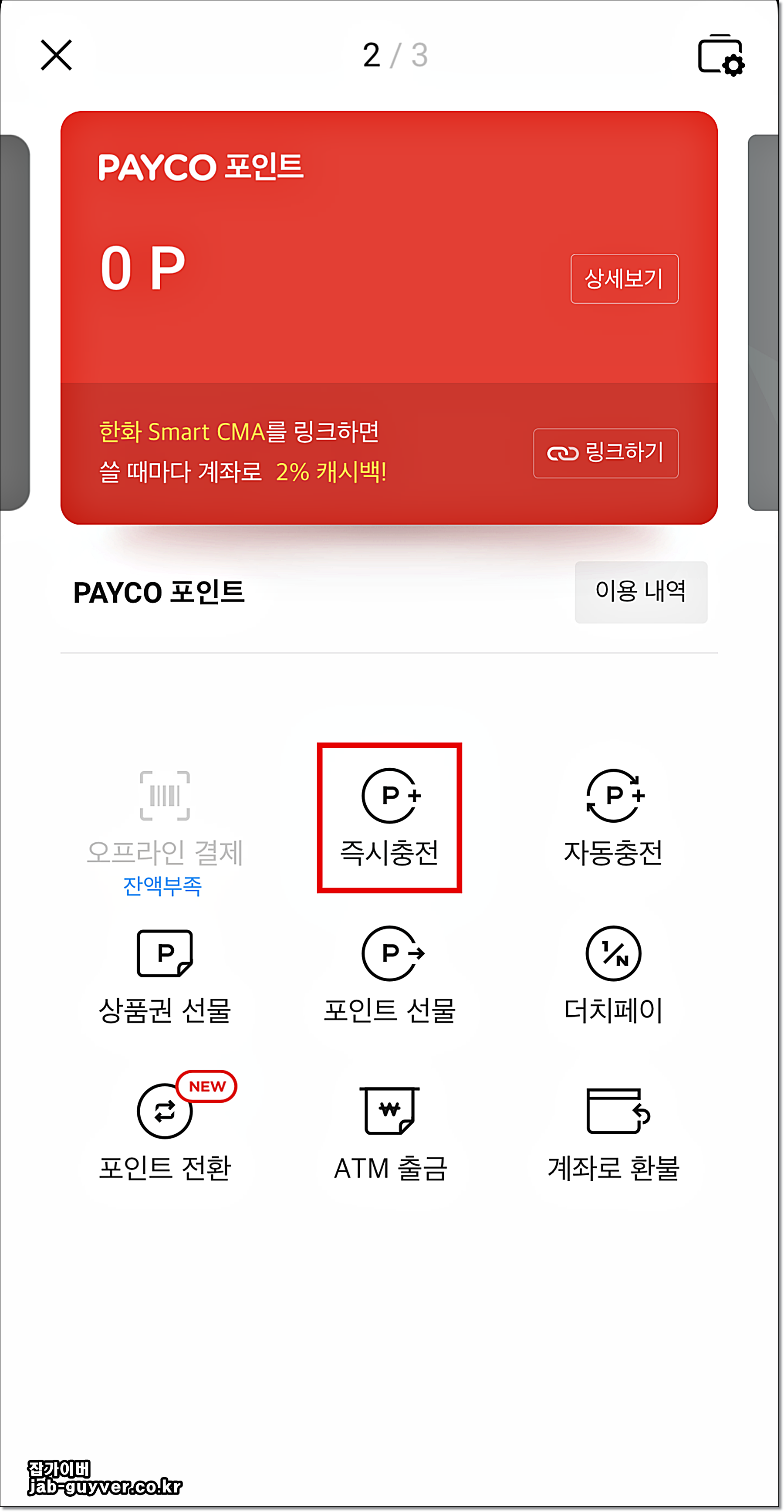 해피머니 상품권을 페이코 포인트로 전환하고자 한다면 "즉시 충전"을 선택합니다.