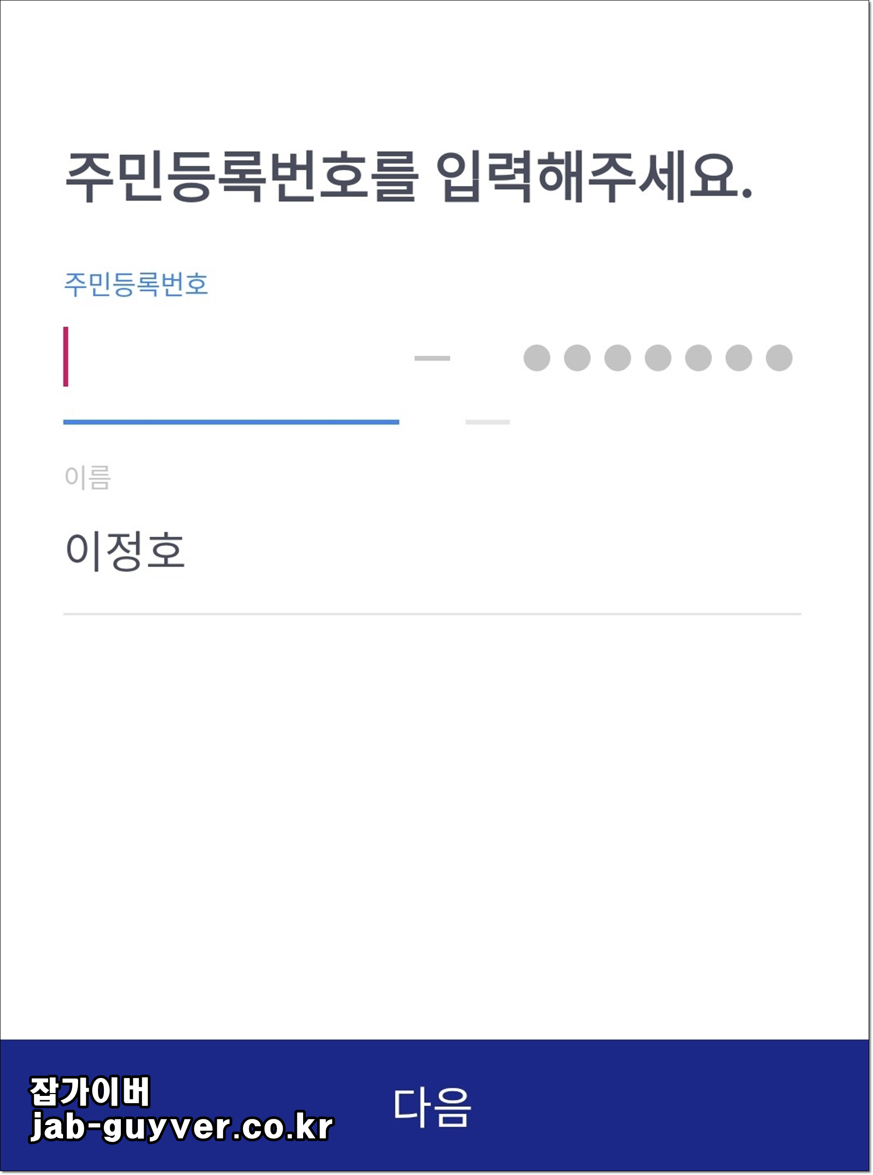 앱을 실행 후 이름과 주민등록번호를 각각 입력해서 회원가입을 진행합니다.