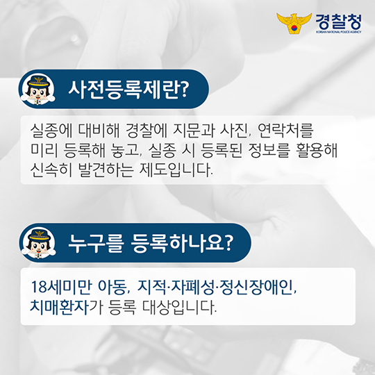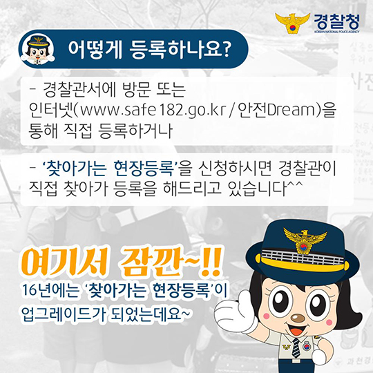 | 경찰서·지구대 방문 | 가까운 경찰서 종합민원실, 지구대·파출소 | 직접 직원 안내를 받으며 등록, 부모·보호자 신분증과 가족관계 서류 지참 |