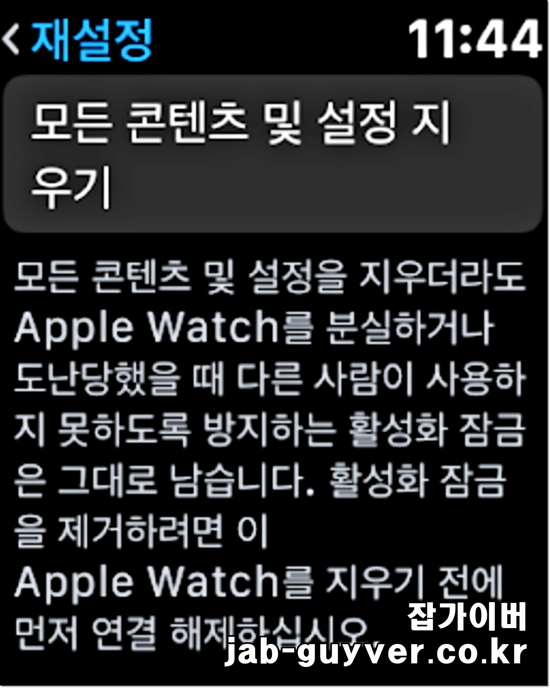 그럼 애플워치의 모든 콘텐츠 및 설정을 재설정하여 지울 수 있습니다.