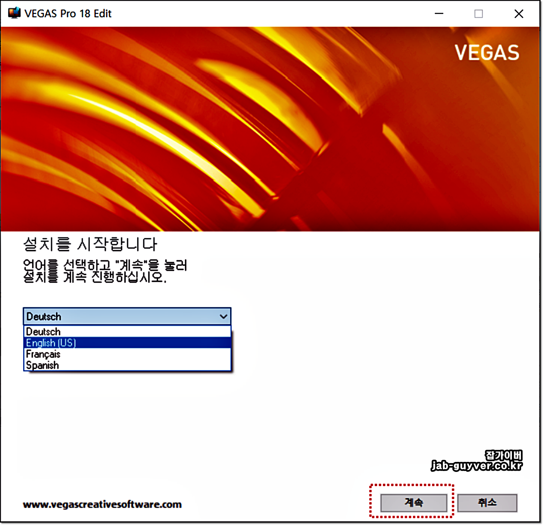 베가스 설치는 영어나 프랑스, 스페인어만 지원하지만 설치는 별로 어렵지 않습니다.