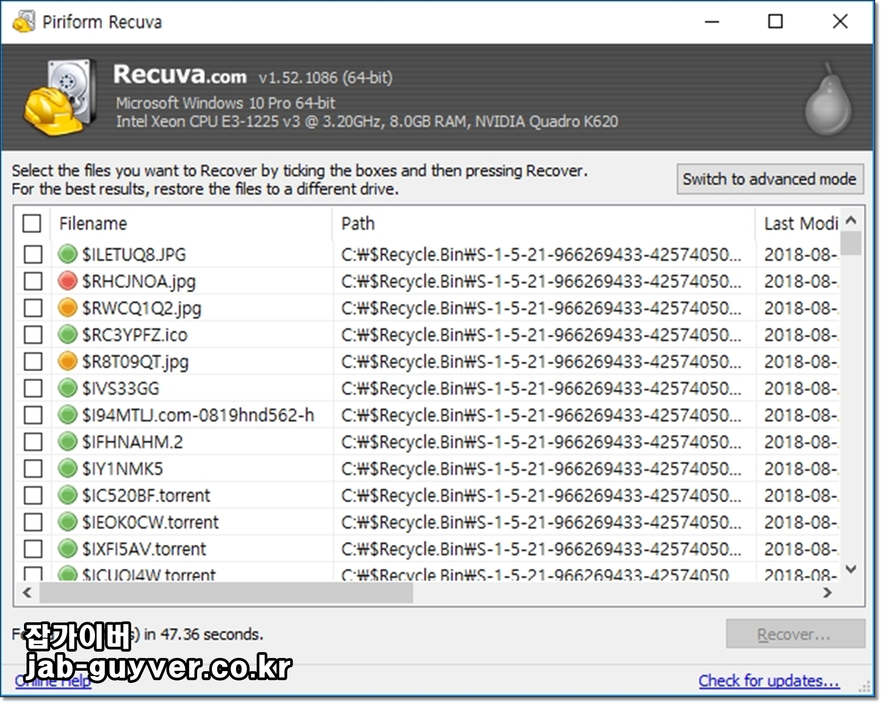 지금까지 휴지통에서 지운 데이터가 스캔되며 녹색, 주황색, 빨간색으로 데이터 복구 가능 확률이 표시됩니다.