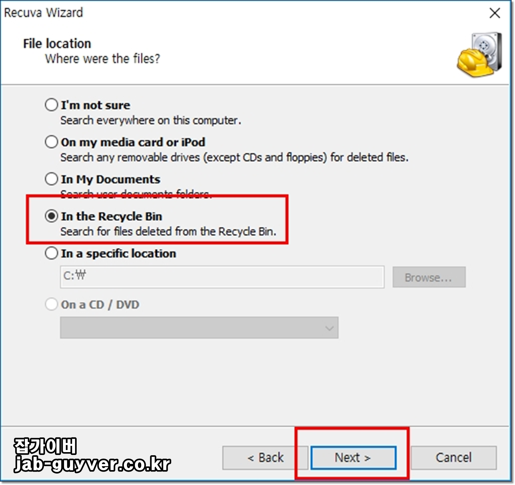 복구할 파일 위치를 선택합니다.