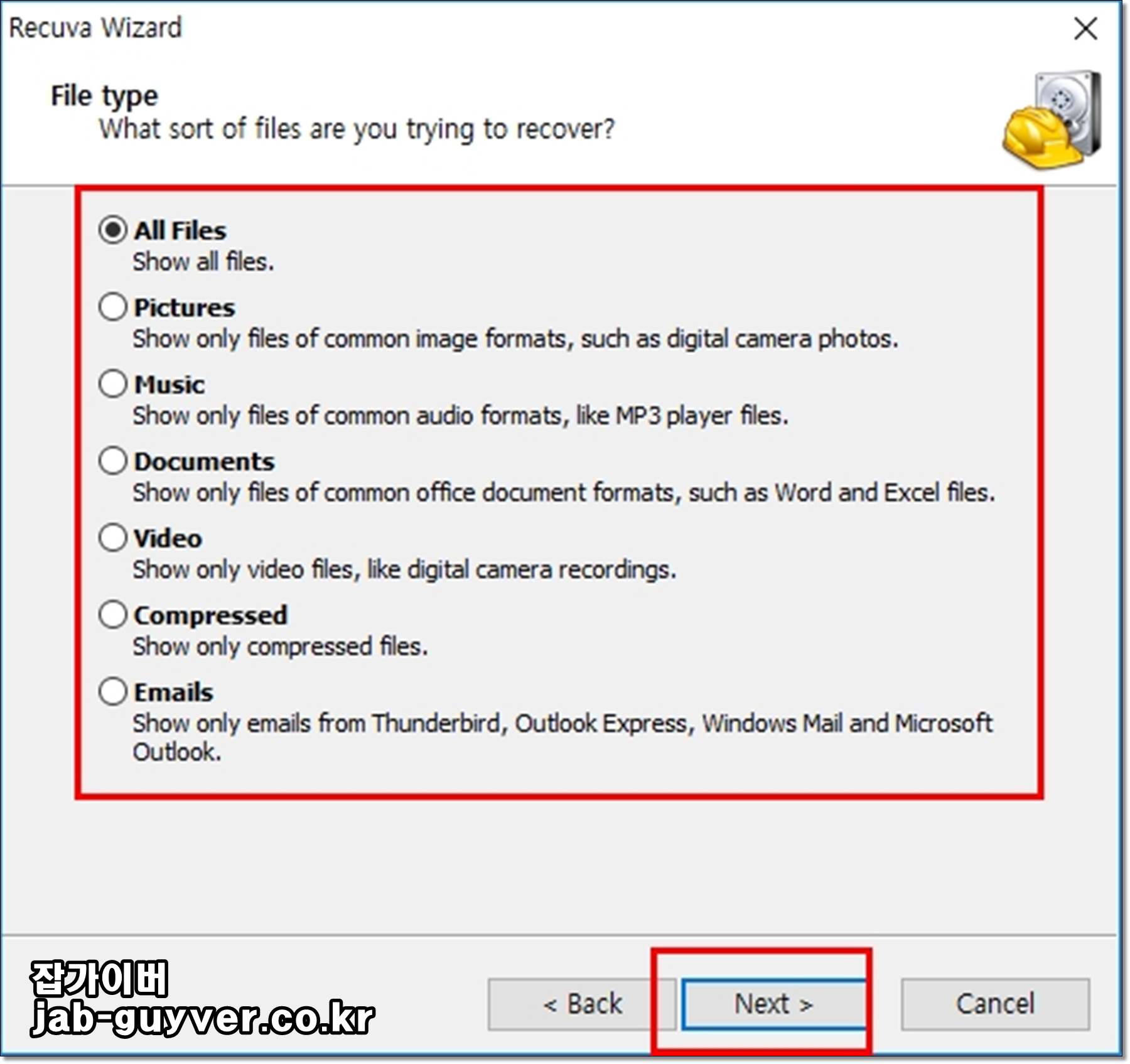 레쿠바를 실행하면 Recuva Wizard 기능으로서 간단하게 손실된 데이터를 복구할 수 있습니다.