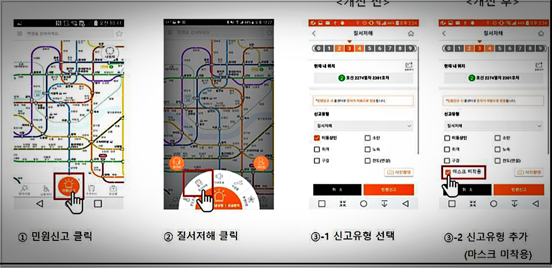 그 외에도 서울시의 경우 핸드폰 지하철 어플 등을 통해 대중교통 마스크 미착용 시 신고가 가능합니다.