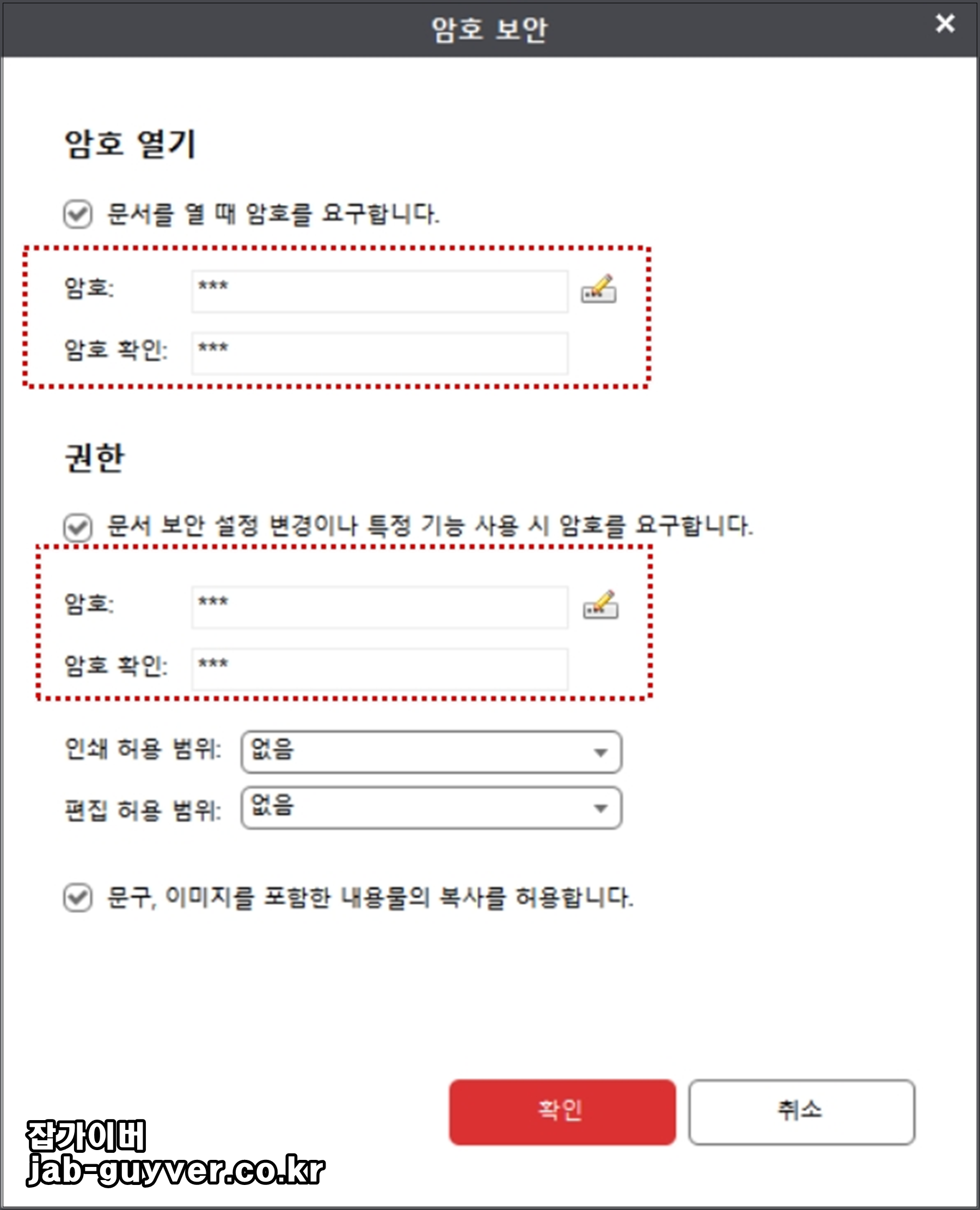 PDF 파일을 열기위한 암호를 입력하거나 PDF파일을 변경하기 위한 암호를 각각 설정할 수 있습니다.