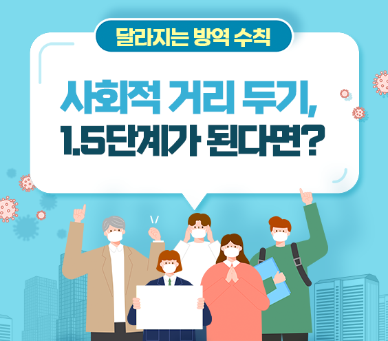 사회적 거리두기 1.5단계의 조건으로는 수도권 일평균 100명 이상의 확진자 발생시 격상됩니다.