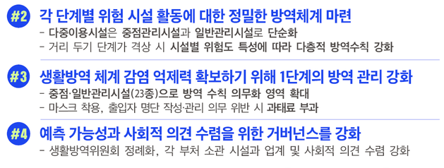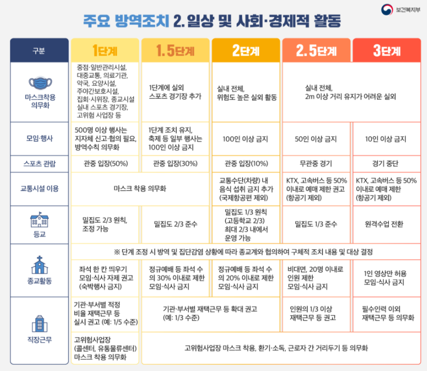 | 핵심 메시지 | 일상 생활과 사회경제적 활동을 유지하면서, 코로나19예방을 위해 방역수칙 준수 | 지역유행 시작, 위험 지역은 철저한 생활방역 | 지역 유행 본격화 , 위험 지역은 불필요한 외출과 모임 자제, 사람이 많이 모이는 다중이용시설 이용자제 |