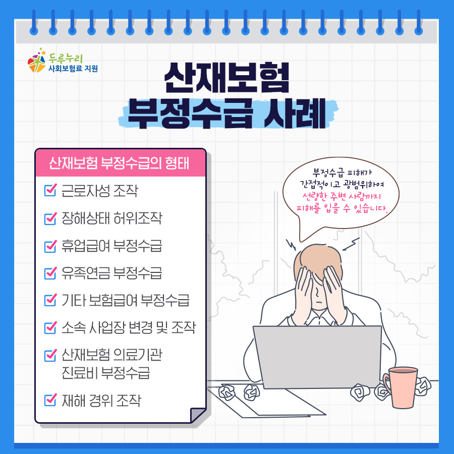 산재보험 부정수급은 근로자 개인, 사업주, 제3자가 함께 맞춰 움직이는 식으로 이뤄지는 경우가 많아서, 주변에서 이런 정황을 보게 된다면 방치하기보다 신고하는 것이 전체 근로자에게도 도움이 됩니다.