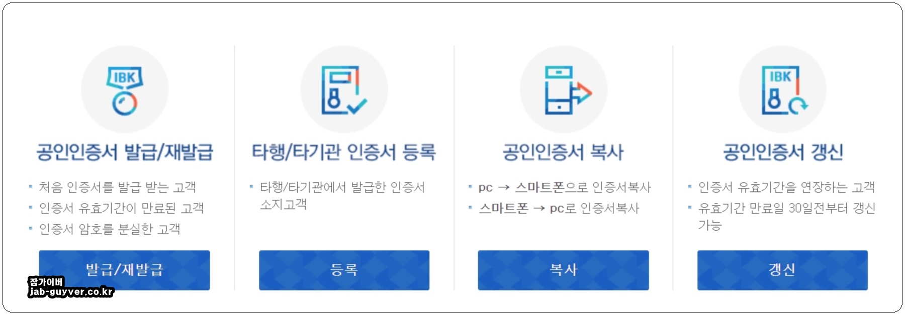 기업은행 기준으로 공인인증센터 메뉴에 들어가면, 공인인증서 발급·재발급, 갱신, 삭제, 스마트폰 복사 같은 기능이 한곳에 모여 있습니다. 여기에서 스마트폰 또는 모바일 공인인증서 복사와 관련된 항목을 골라주면 아이폰으로 옮기기 위한 준비가 시작됩니다.