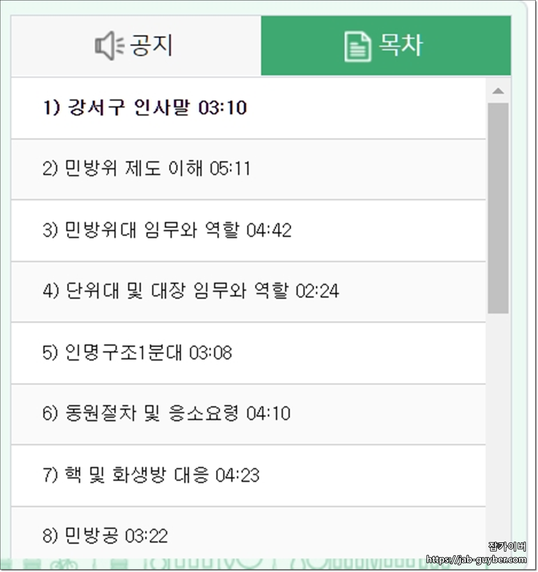 총 민방위 문제는 20문제로 총1시간의 분량으로 16개의 강의로 이루어져있습니다.