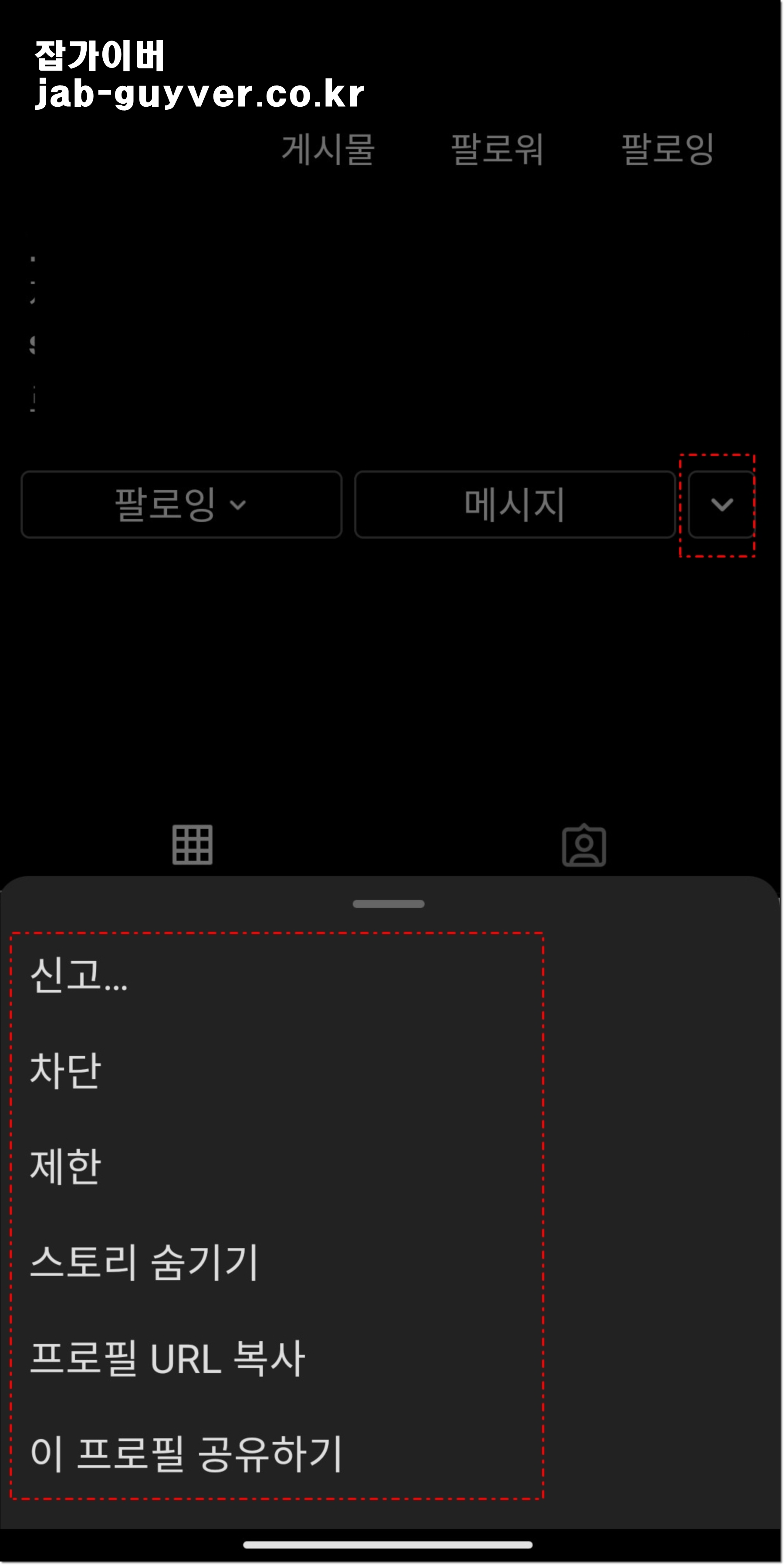 인스타 앱 실행 → 차단할 상대 프로필로 이동 → 프로필 오른쪽 상단 ⋯(점 3개) 또는 관리/옵션 메뉴 선택 → 차단