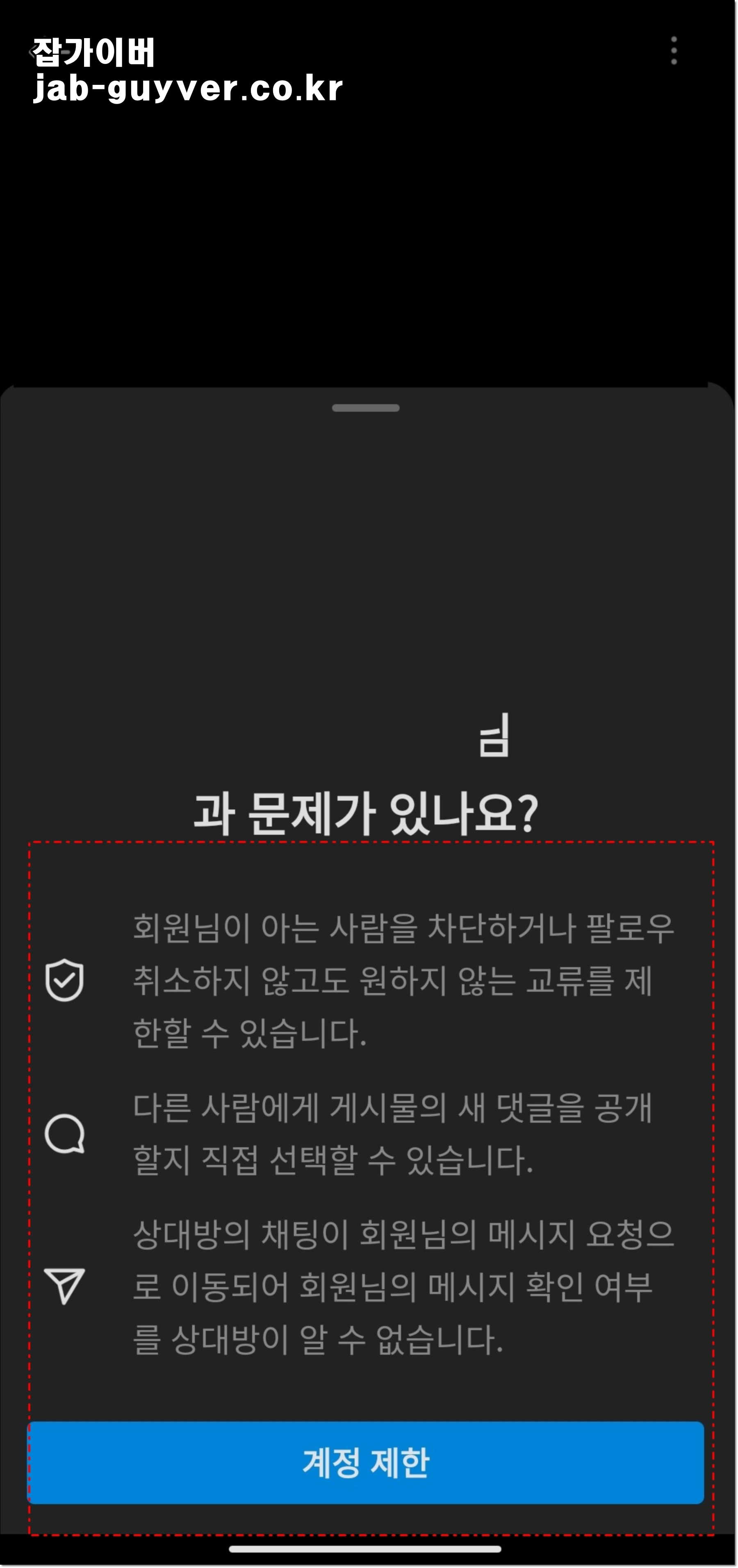 인스타 앱 실행 → 상대 프로필 → 오른쪽 상단 ⋯ 또는 옵션 메뉴 → 제한