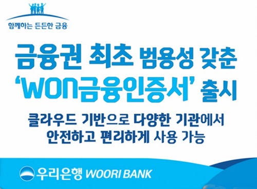 가장 먼저 어제(17일) 우리은행이 WON 금융인증서를 선보였으며 모바일 어플리케이션에서 보안카드나 OTP 또는 신분증 촬영, 계좌 인증을 통해 본인확인절차를 거칩니다.