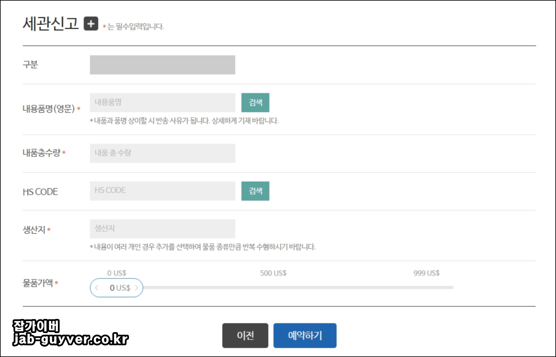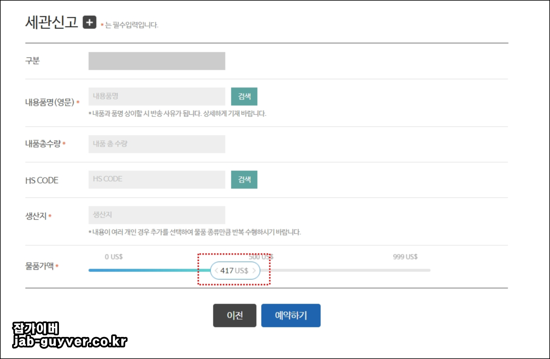 배송하는 물품가액을 달러기준으로 선택 후 예약하기를 눌러주면 편의점 해외택배 예약이 완료됩니다.