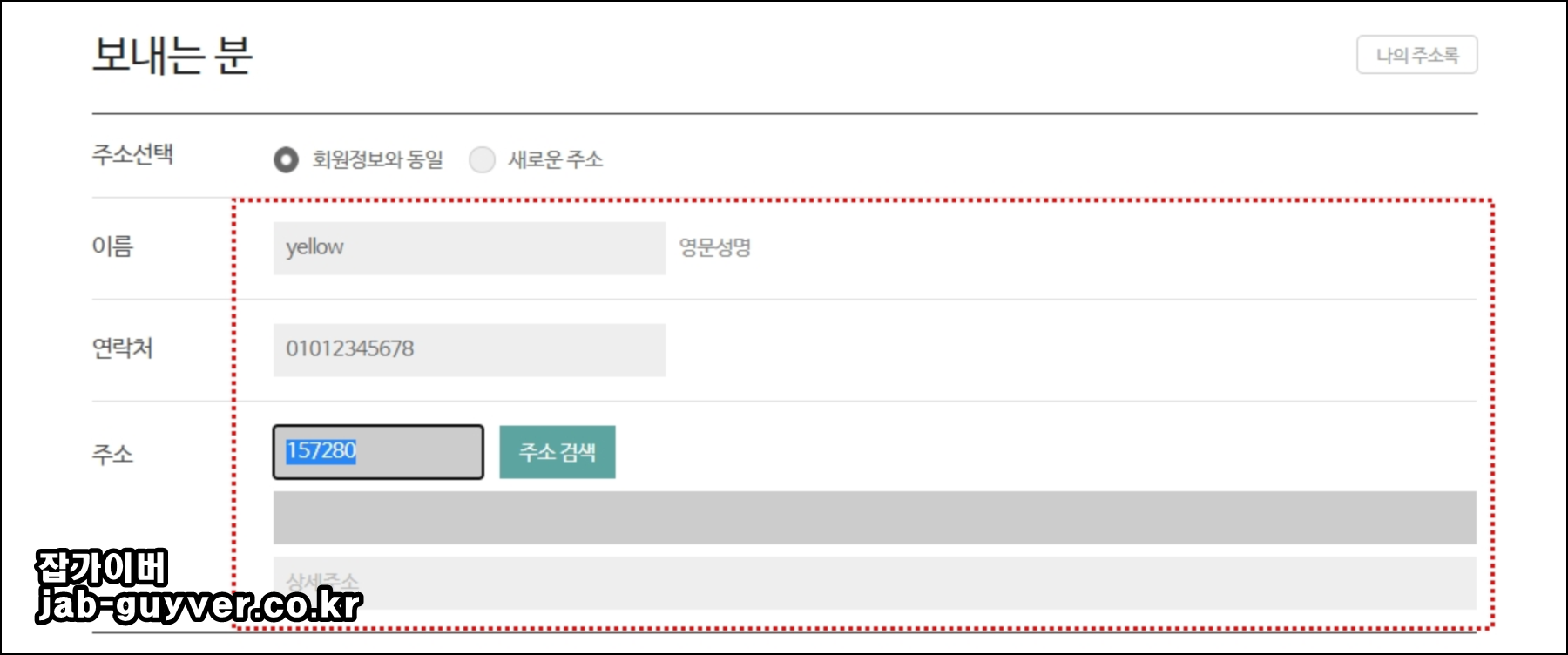 보내는 사람 본인의 정보를 이름과 연락처 주소를 입력합니다.