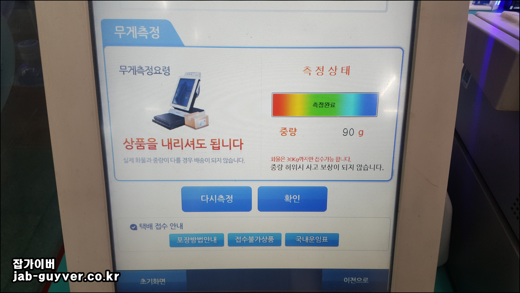 이후 인터넷으로 예약한 택배배송 물품을 선택 후 무게를 측정합니다.