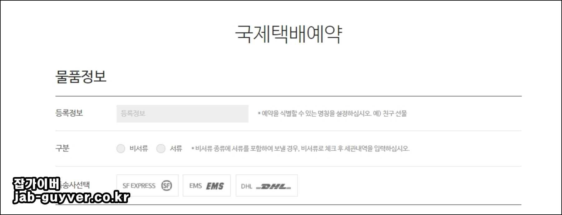 국제택배예약을 통해 현재 배송하고자 하는 물품의 정보와 서류가 있다면 함게 체크합니다.