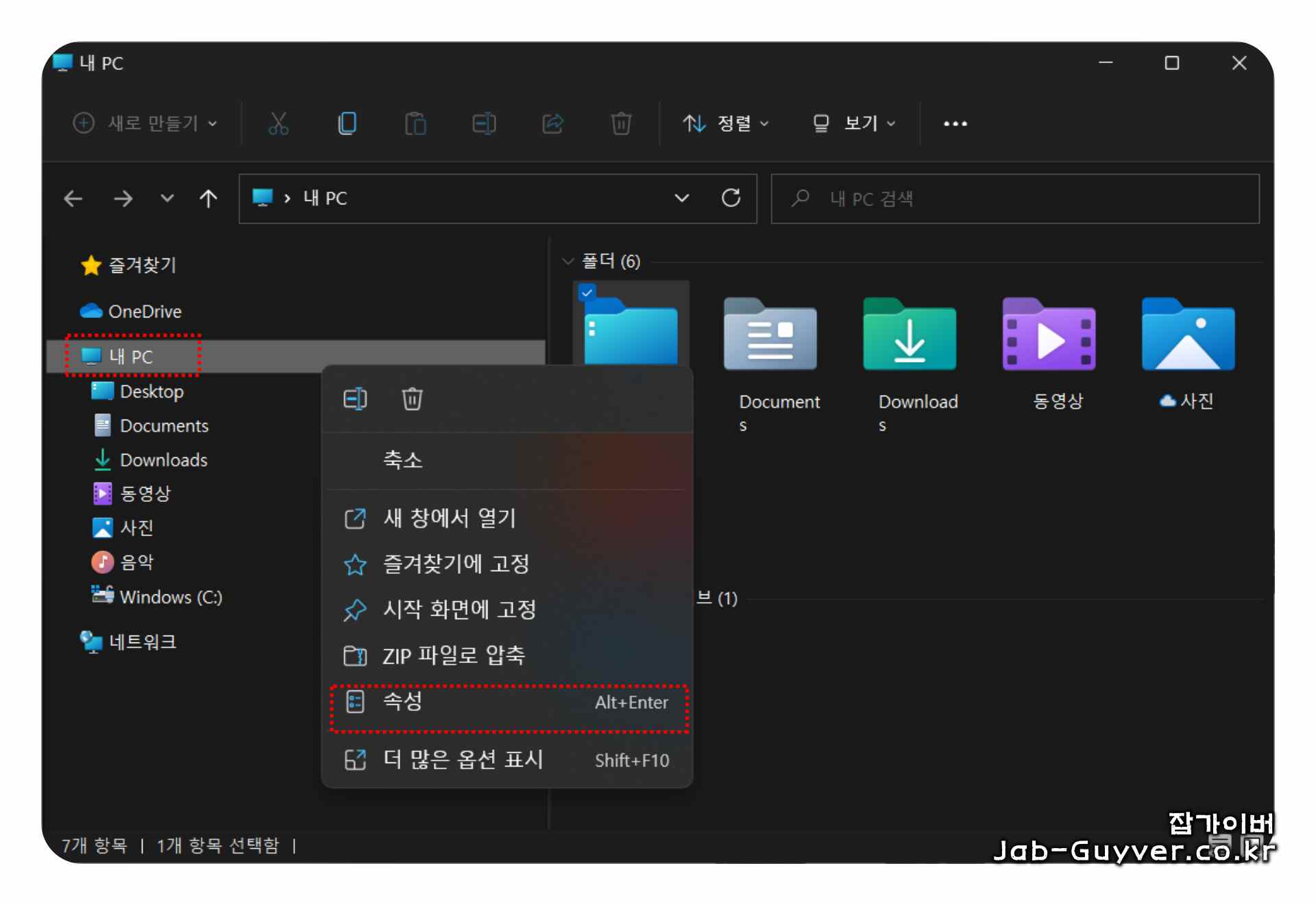 내PC를 실행합니다. 마우스 우클릭 후 속성(단축키: Alt + Enter)을 선택합니다.