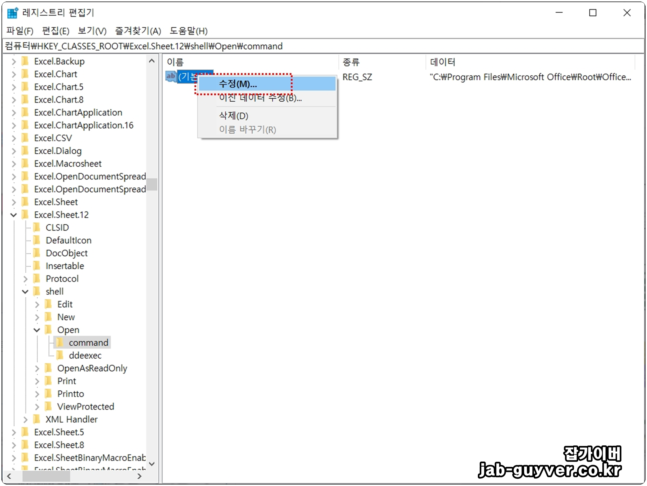 하나 남아있는 기본값 레지스트리를 수정을 선택합니다.