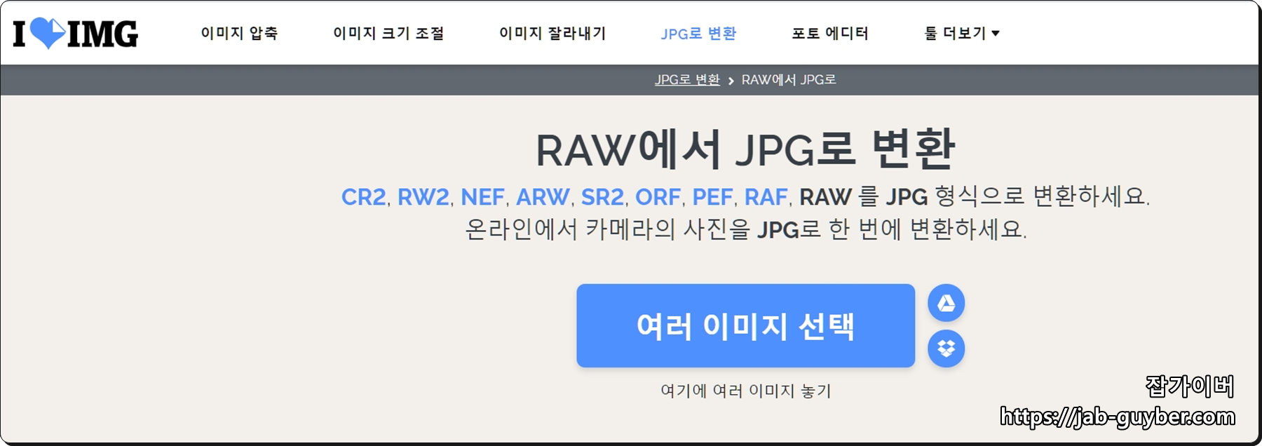 프로그램을 설치하기 어려운경우라면 온라인 사이트 I Love Img 홈페이지를 통해 RAW 확장자 외에도 CR2,RW2,NEF,ARW,SR2,ORF,PER 확장자를 JPG로 여러 이미지를 한번에 무료로 변환할 수 있습니다.