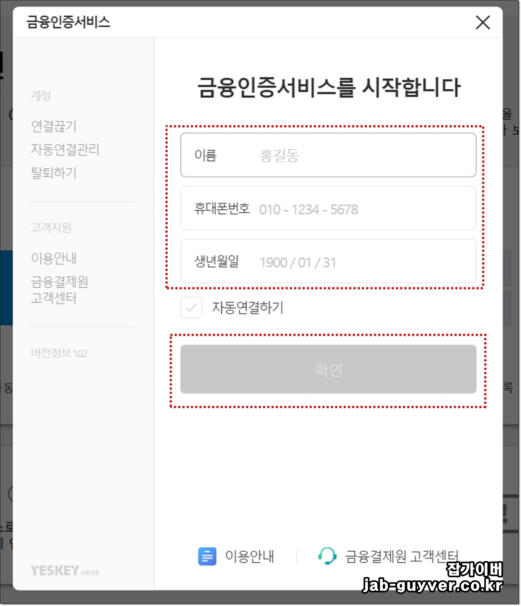 금융인증 서비스를 위해 이름과 휴대폰번호,생년월일을 입력합니다.