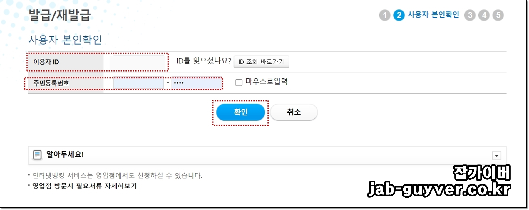 이용자 ID 및 주민등록번호를 입력 후 확인을 눌러줍니다.