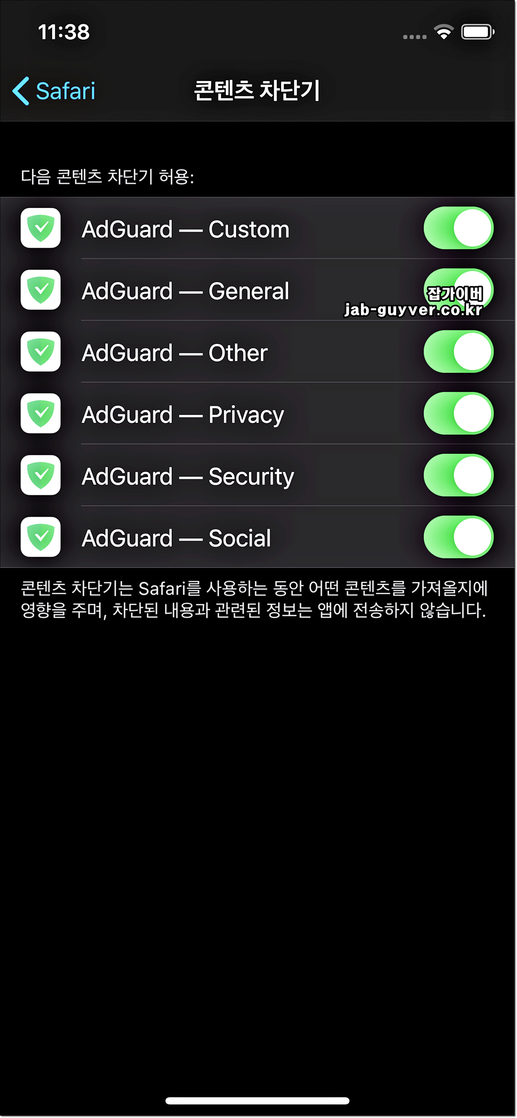 콘텐츠 차단기로 들어가면 애드가드를 통해 보안 및 소셜등 모두 체크해줍니다.