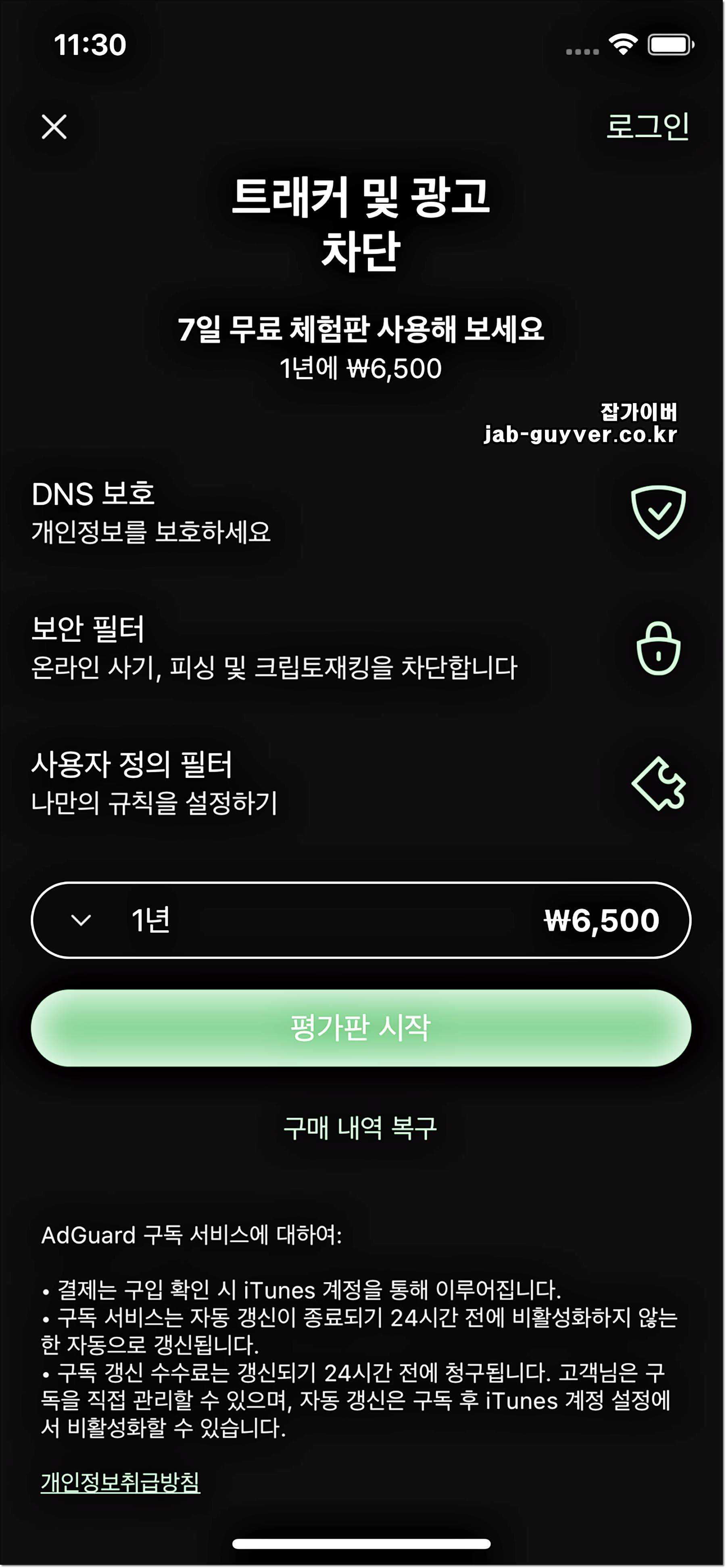 애드가드의 1년 사용요금은 6천500원으로 유튜브 프리미엄 요금제 1달 요금보다도 저렴한 가격입니다.
