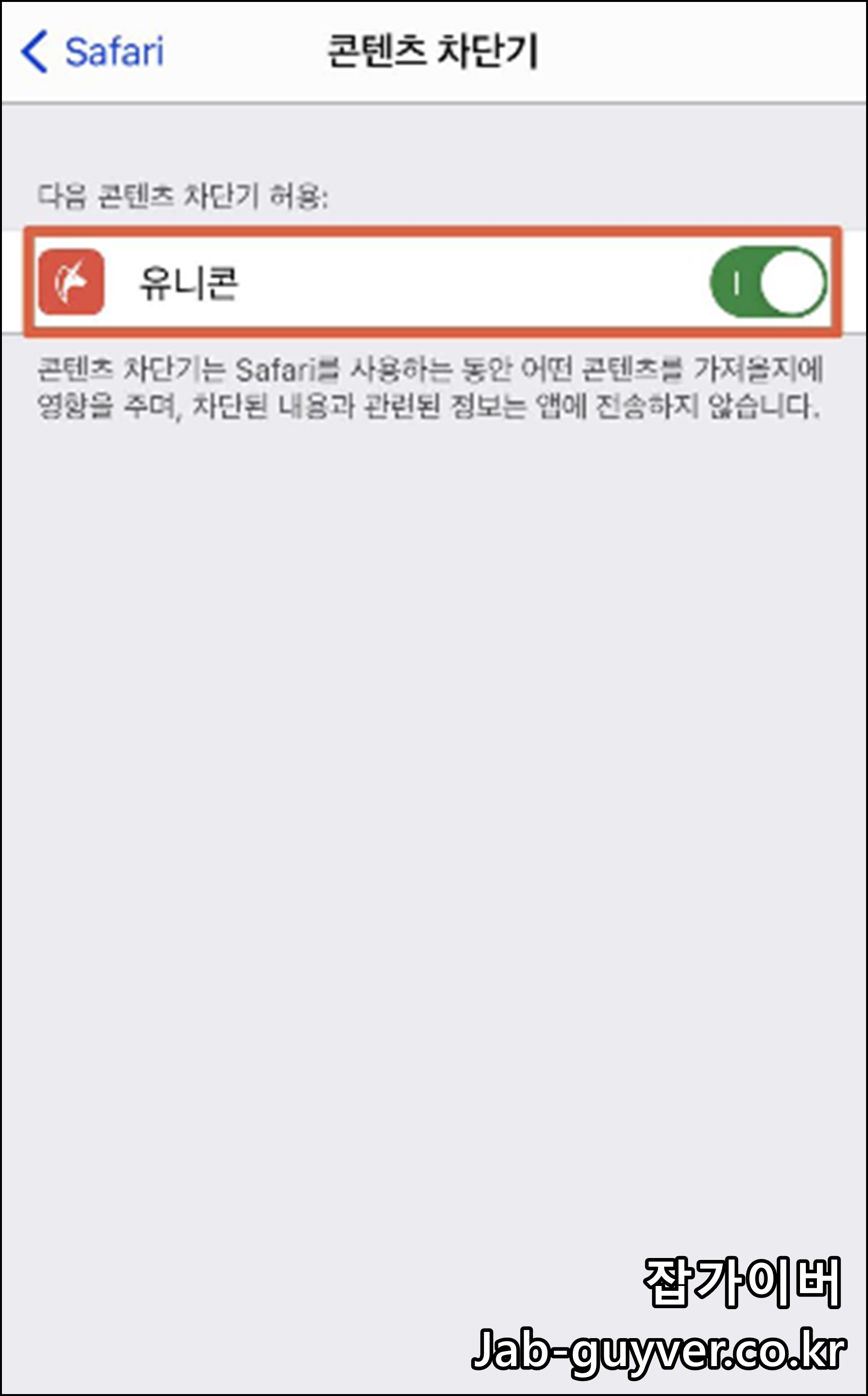 유니콘을 설치하더라도 동일하게 사파리 앱에서 콘텐츠 차단기 -> 앱을 허용으로 변경해주면 유튜브 및 인터넷 광고등이 모두 차단됩니다.