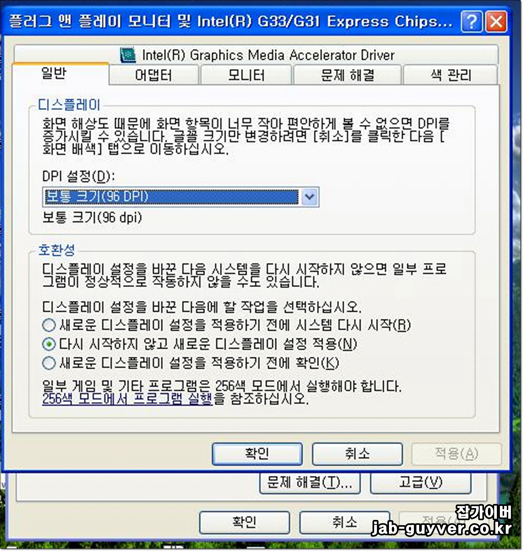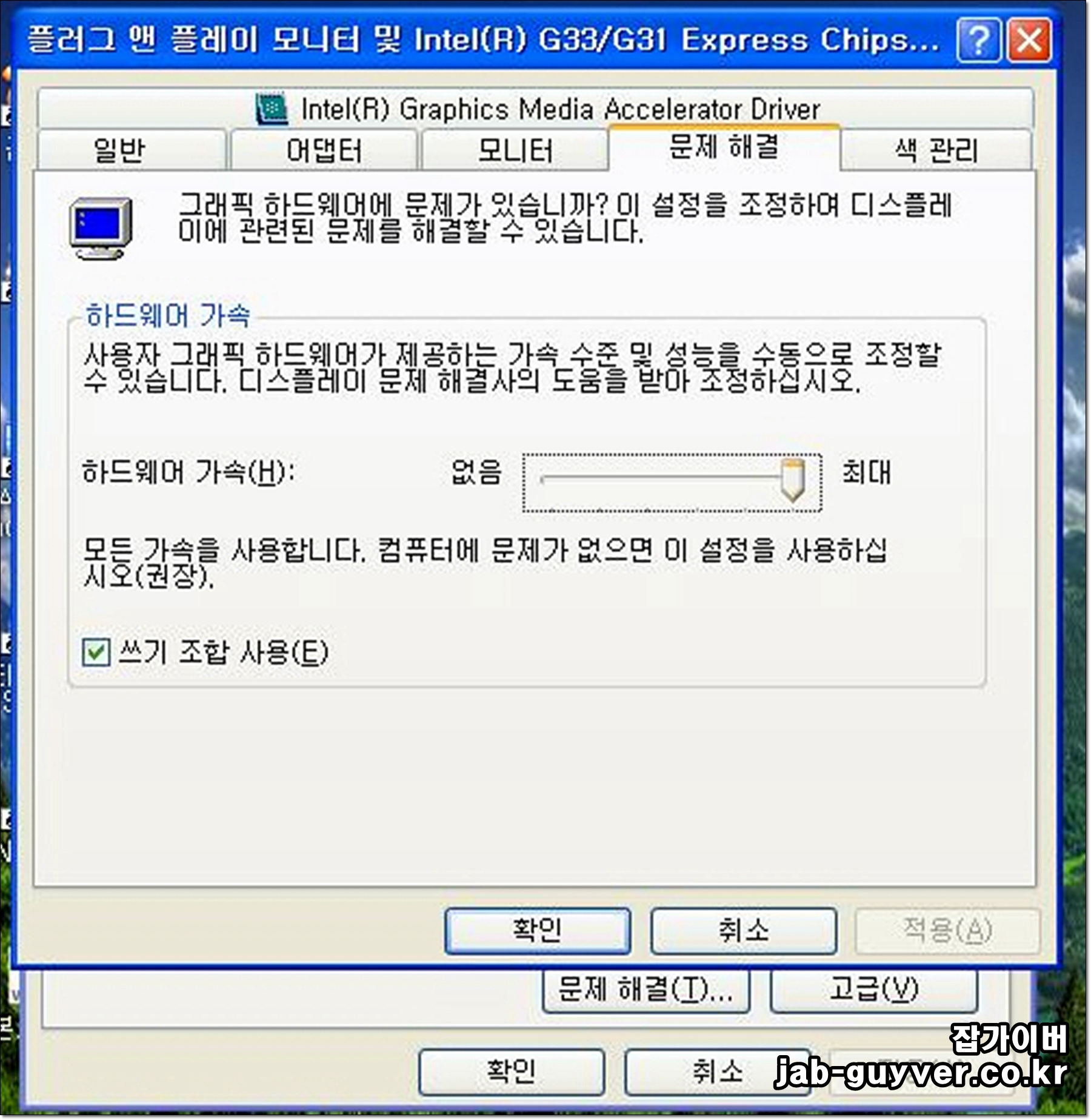 그리고 확인을 눌러주면 윈도우7 그래픽카드의 하드웨어 가속끄기 설정이 완료됩니다.