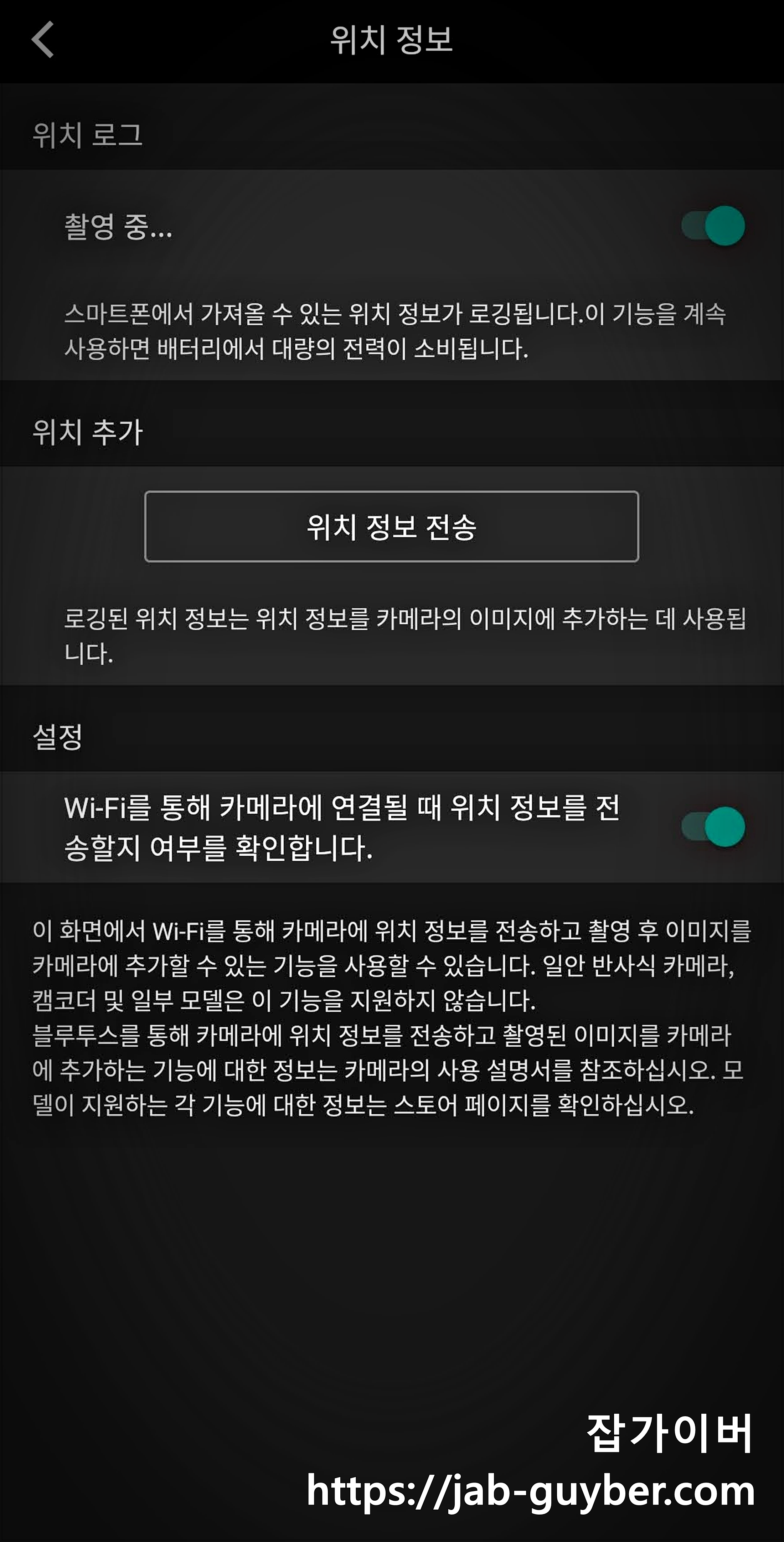 카메라에 있는 GPS를 통해 위치정보를 전송하며 촬영 시간 등은 핸드폰과 페어링을 통해 날짜, 시간, 지역 등을 동기화합니다.