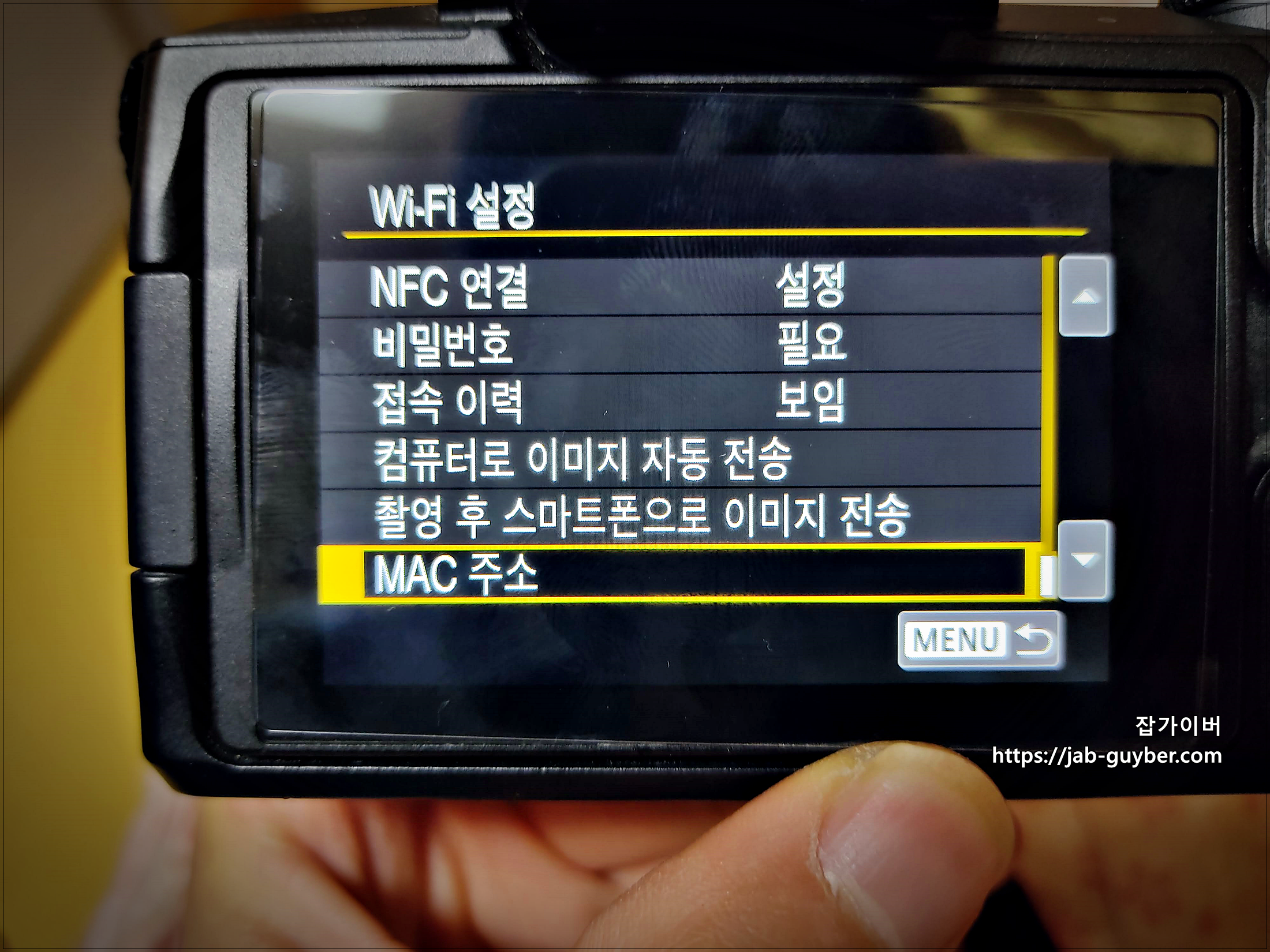 우선 네트워크 연결을 위해 카메라의 MAC Address"Mac 주소를 확인할 수 있습니다.