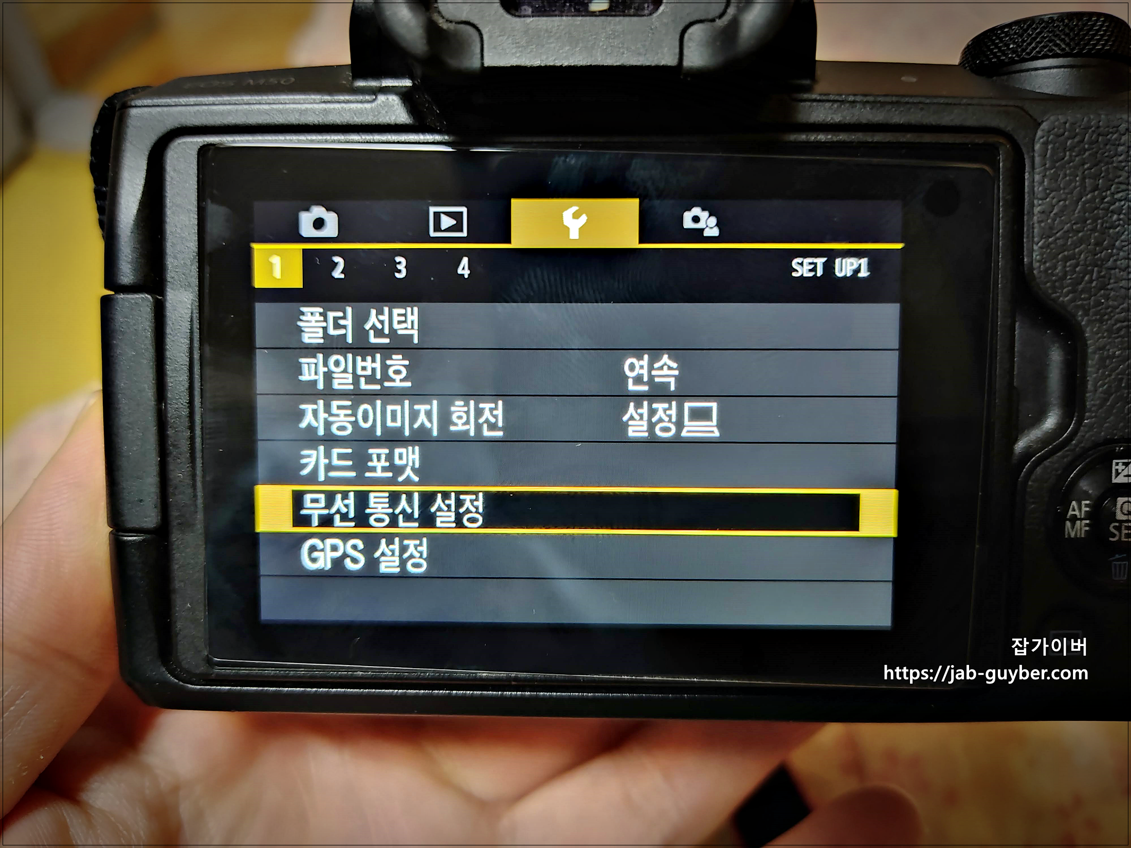 우선 캐논 카메라에 무선통신 설정을 진행합니다.