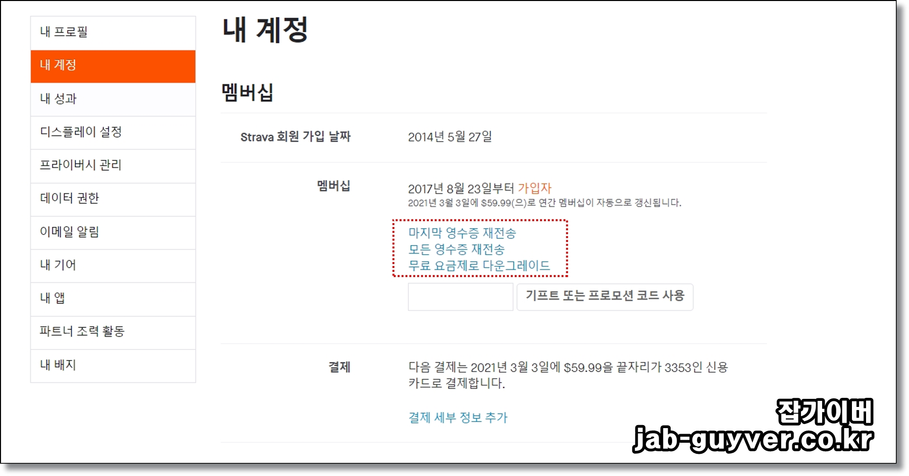 - 스트라바 멤버십 결제 영수증을 전달