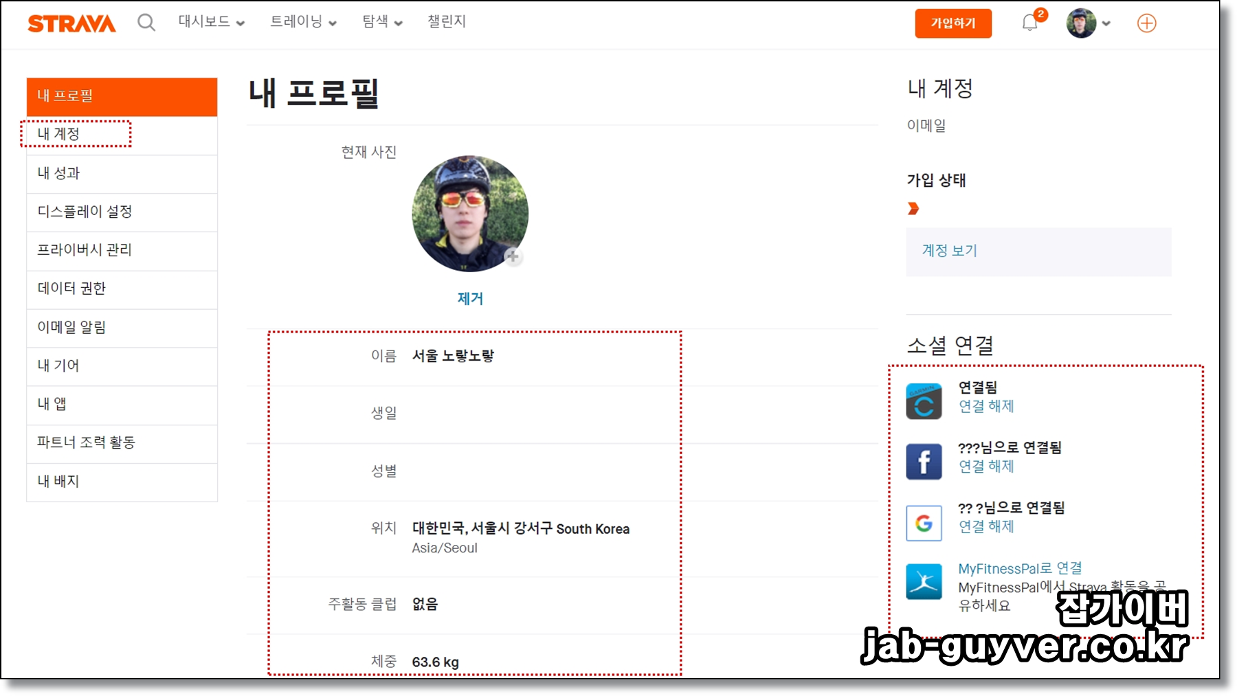 스트라바의 이름, 생일, 성별, 위치, 활동 클럼, 체중 등을 확인할 수 있으며 소셜 연결을 통해 저는 페이스북, 구글 피트니스, MyFitnessPal, 가민 커넥트"Gramin Connet"등 연결할 수 있습니다.