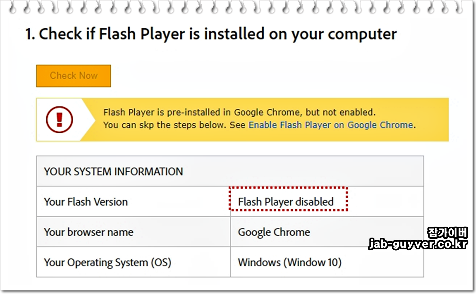 현재 저의 플래쉬 버전이 "Flash Player Disabled"로 되어 있기 때문에 제 컴퓨터에는 플래쉬가 설치되지 않은것을 확인할 수 있습니다.