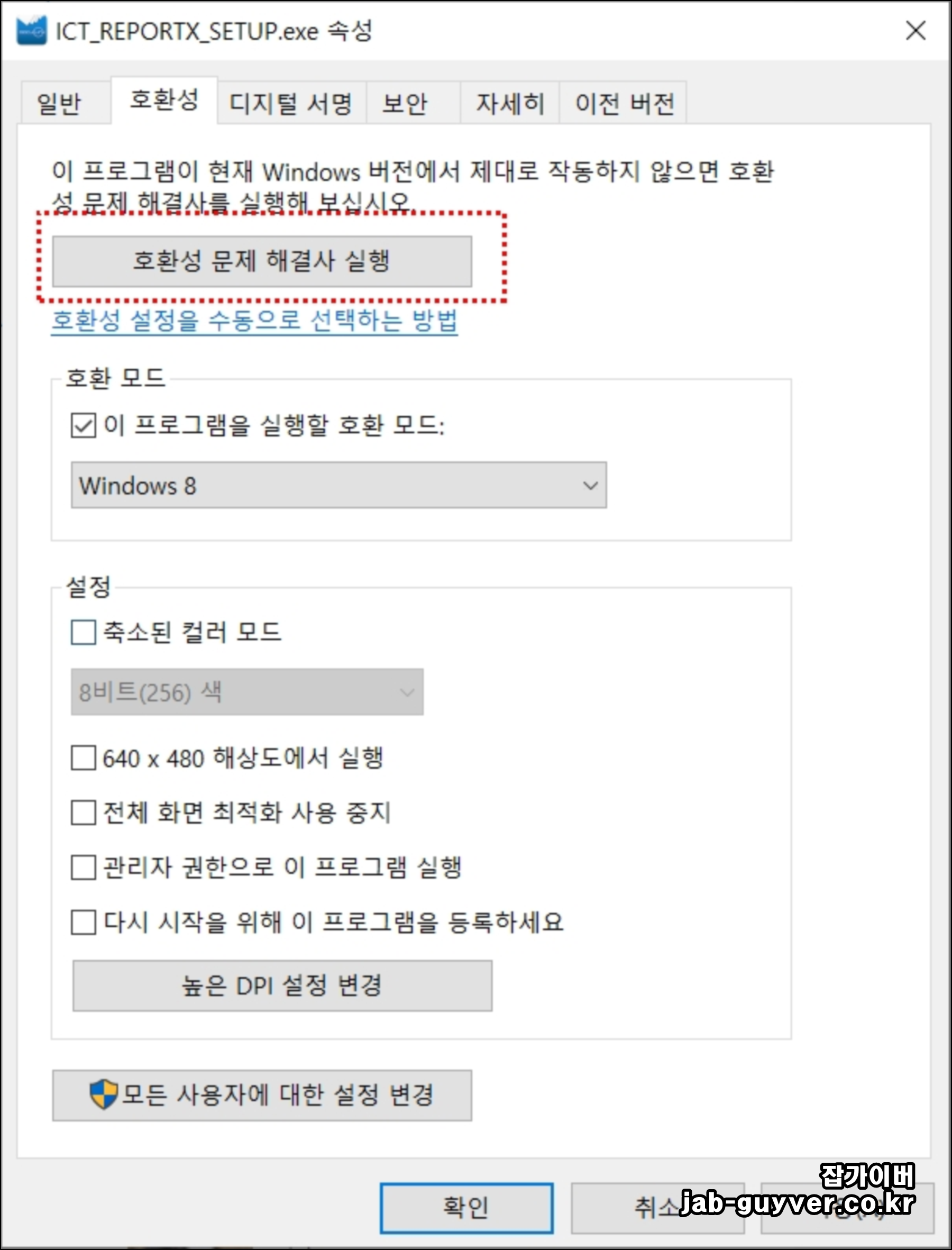 호환성 탭으로 이동하면 "호환성 문제 해결사 실행"이 있습니다.